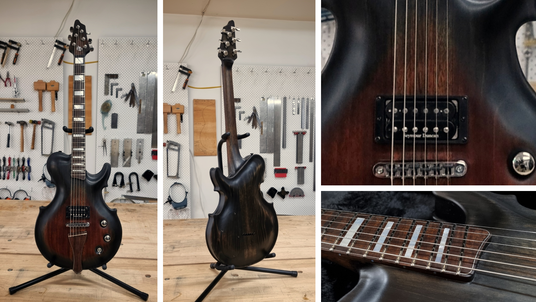 Crafted over two years from reclaimed Australian hardwoods, this guitar blends classical inspiration with modern function. It features a carved Blackwood and Silky Oak body, Gidgee details, and an active Piezo bridge for both electric and acoustic tones.