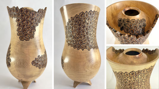 Turned from Victorian Camphor Laurel, this hollow vessel explores the challenge of deep hollowing with clean internal surfaces and even walls. Lacking natural grain interest, the piece was textured using a micromotor, burrs, and pyrography. A deliberate cut reveals the interior, suggesting decay slowly consuming the form.