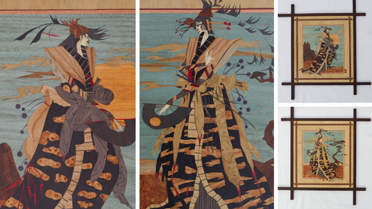 A pair of Samurai warriors in full ceremonial dress, presented within a Japanese-style Jarrah frame with a cherry veneer back. Crafted using traditional knife-cut marquetry techniques, the piece incorporates coloured and natural veneers, assembled with hide glue, and finished by hand with shellac and wax.