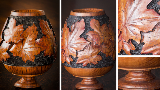 Multiple tools and techniques were employed to create the maple leaves: a Wecher was first used to remove the bulk of the material, followed by a power rotary tool for detailed shaping, and an improvised 5mm sander for the final refinement. Pyrography was applied to both the background and the veins on the leaves, adding subtle texture and detail.
