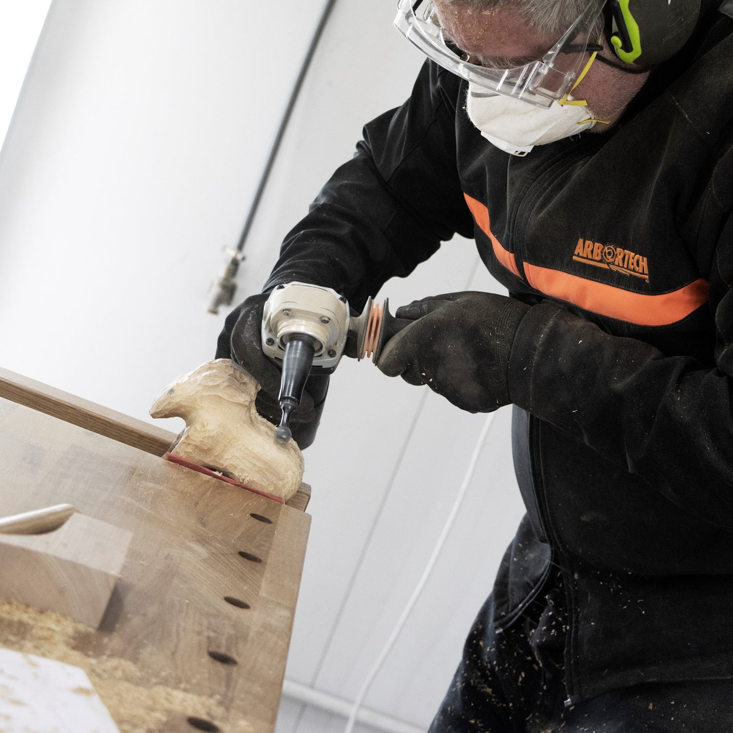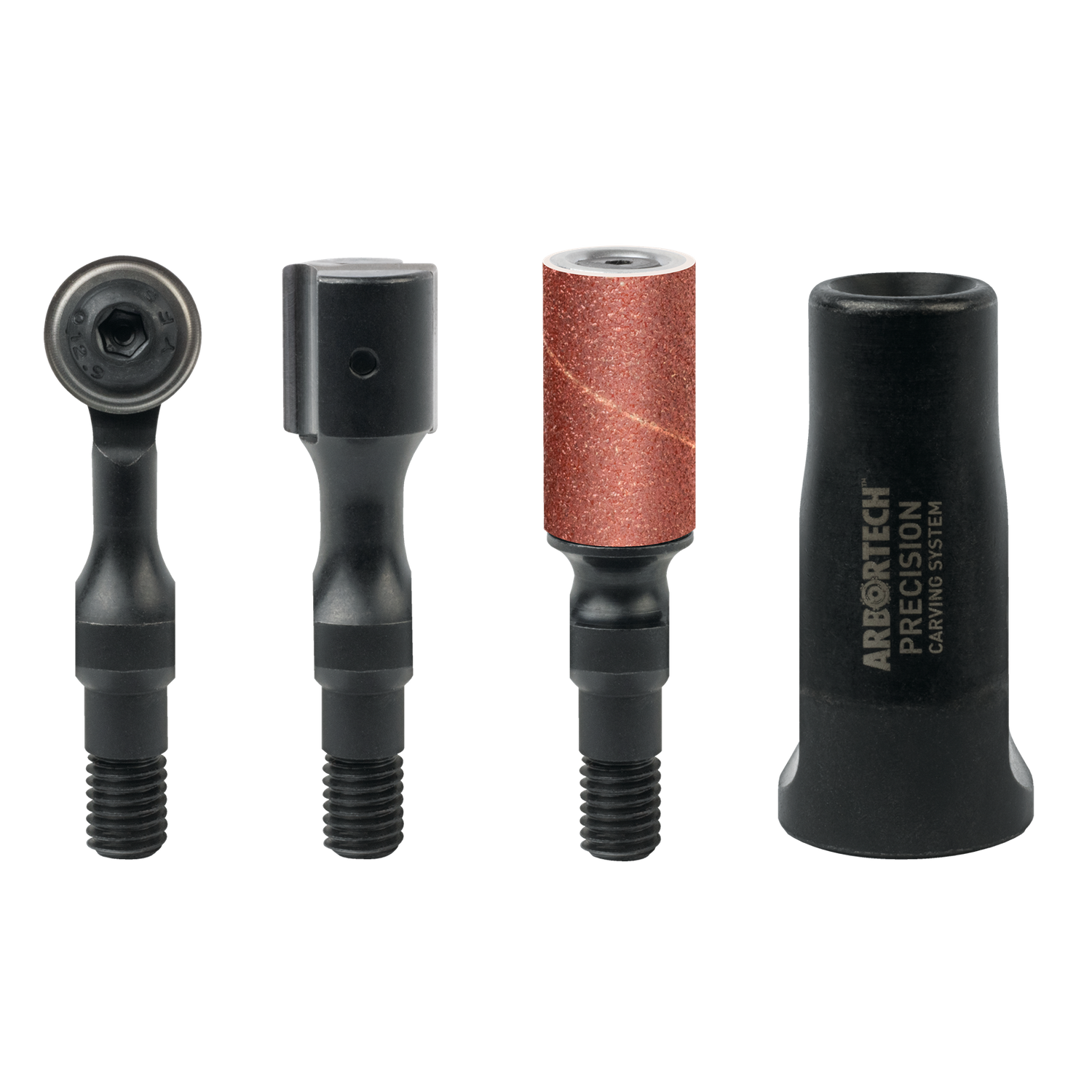 The Precision Carving System is a 4 piece precision set that will open the door to more intricate Arbortech power carving, detailing and texturing. It includes a Universal Base that when fitted to the Power Carving Unit or a quality M14 angle grinder, allows users to interchange the precision carving and sanding bits to carve smaller radii, intricate details and fine textures in wood.