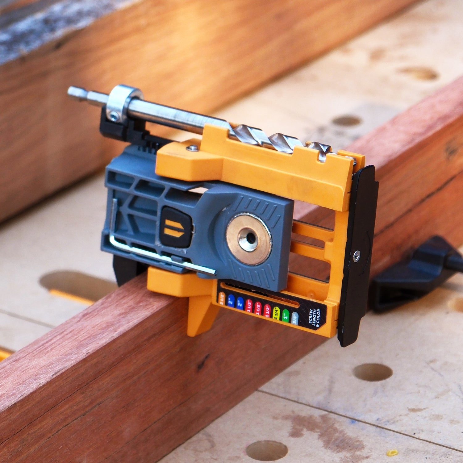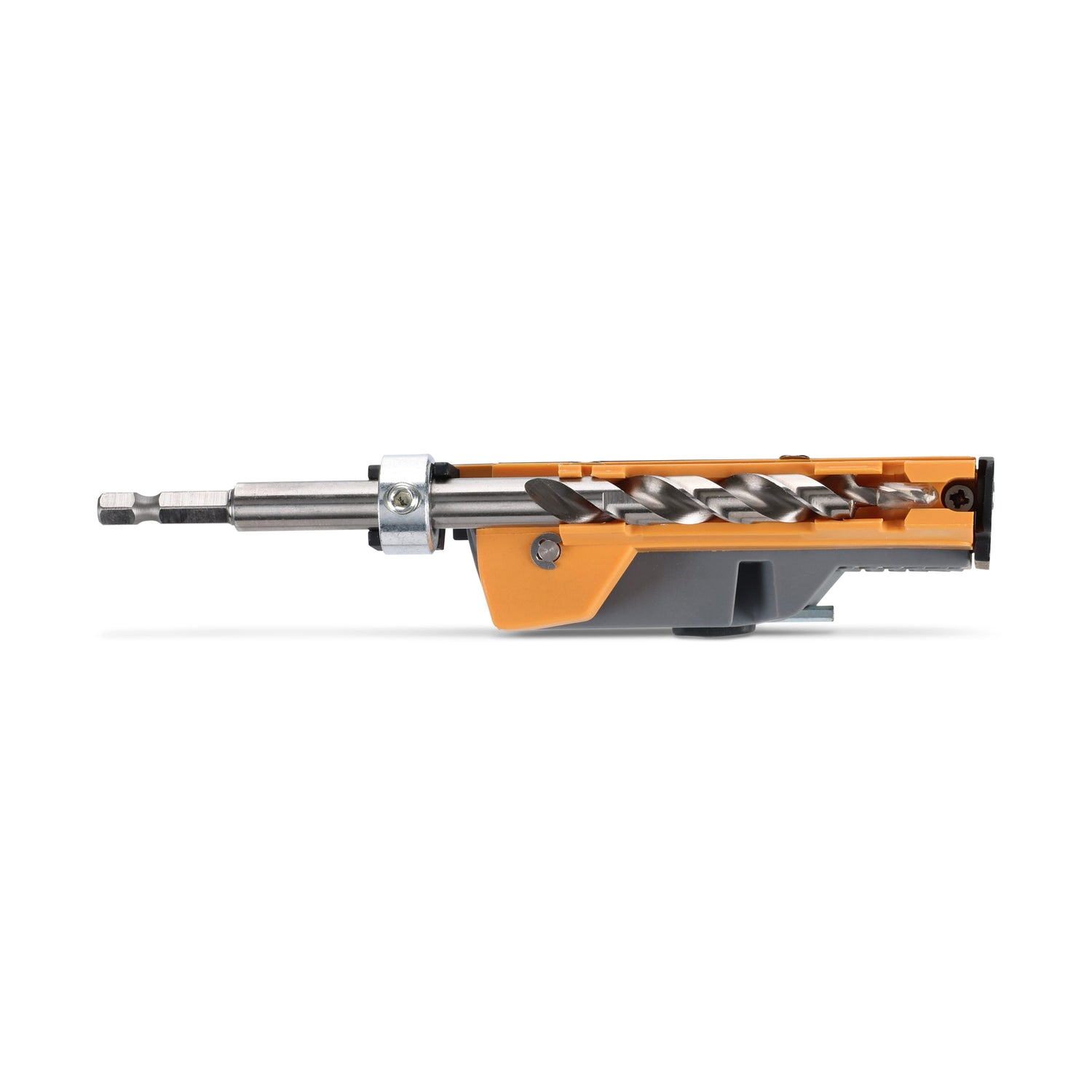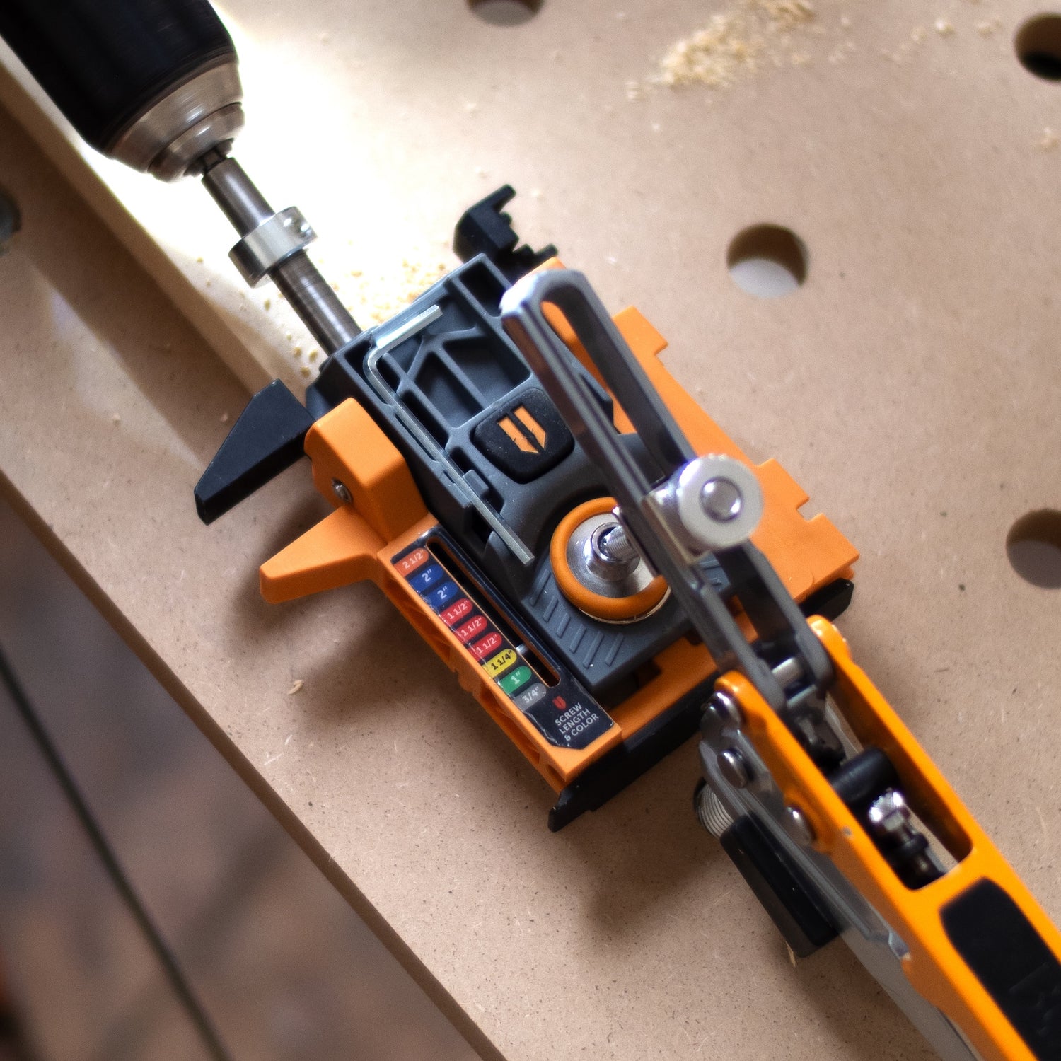 BORA Tools Mini Jig features all the same self-adjusting features as the Auto-Jig in a smaller portable body including the self-adjusting guide block, drill bit collar and colour-coat screw system.