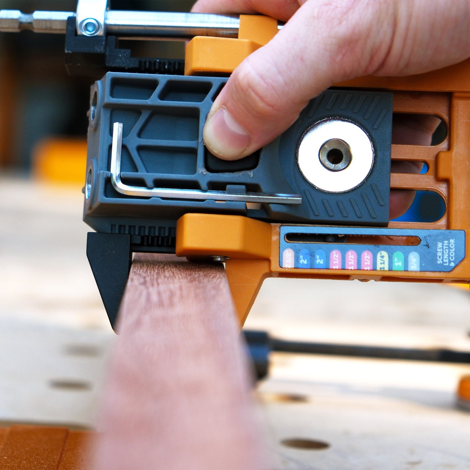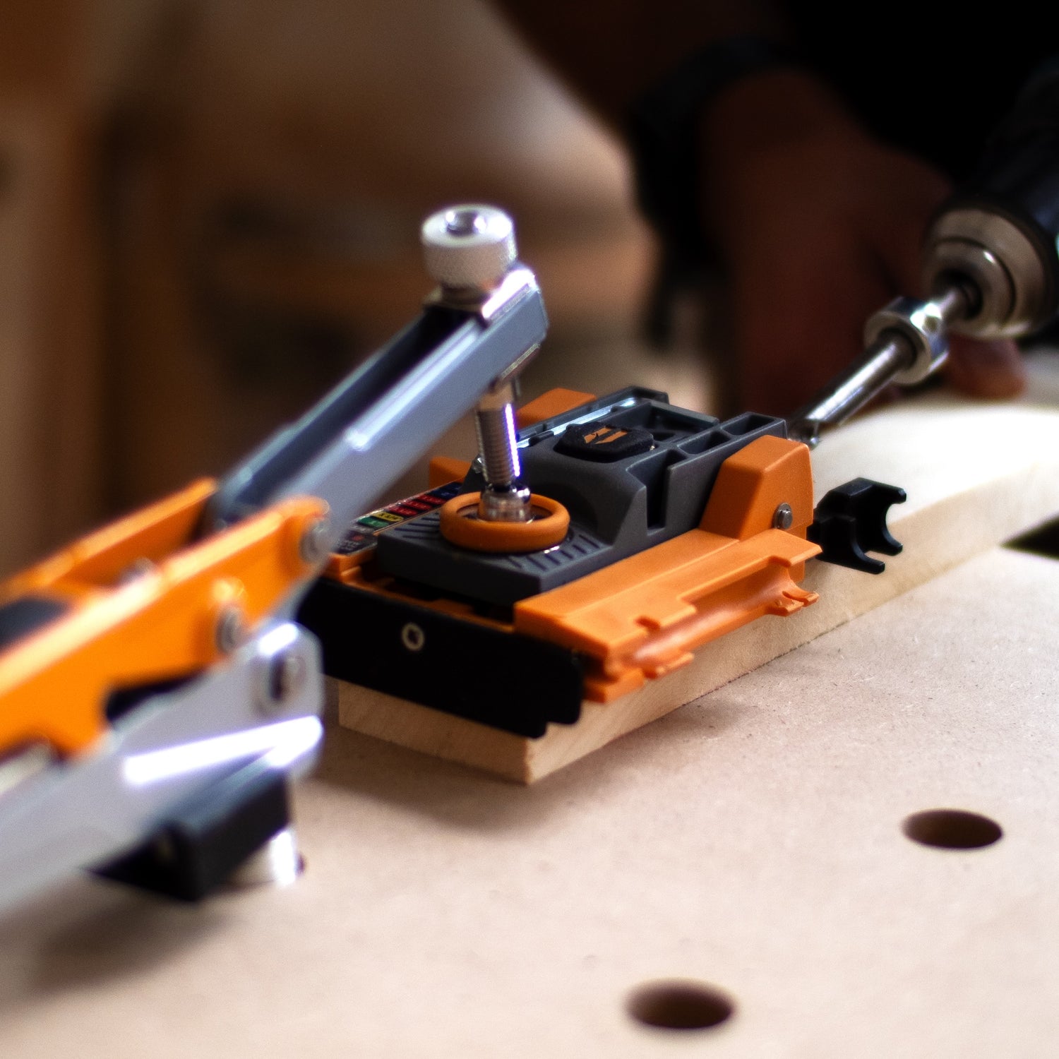 The Mini Jigs self-adjusting system will set your drill guide and drill bit collar depth automatically. Just grab the material thickness with the Mini Jig callipers and the rest is done for you. No more manual setting, measuring or adjusting - simply grab and go!