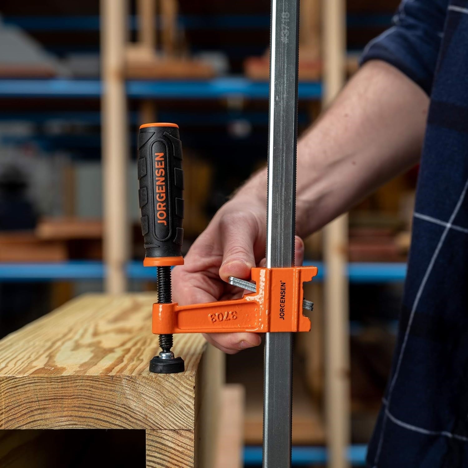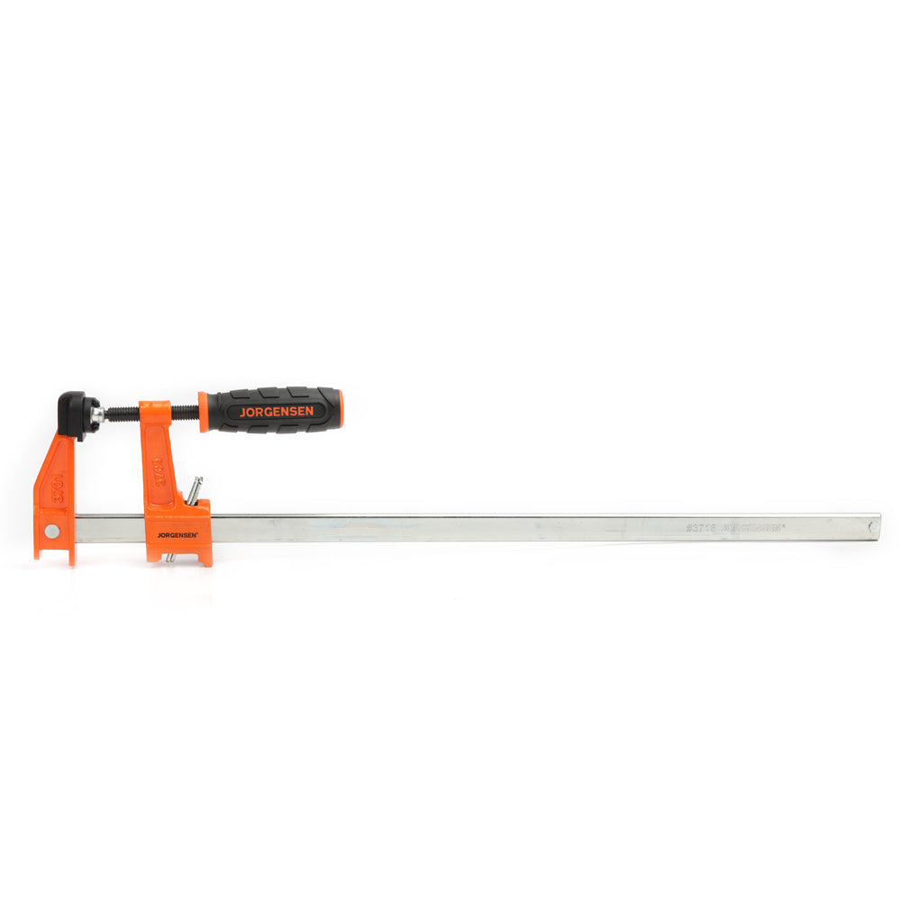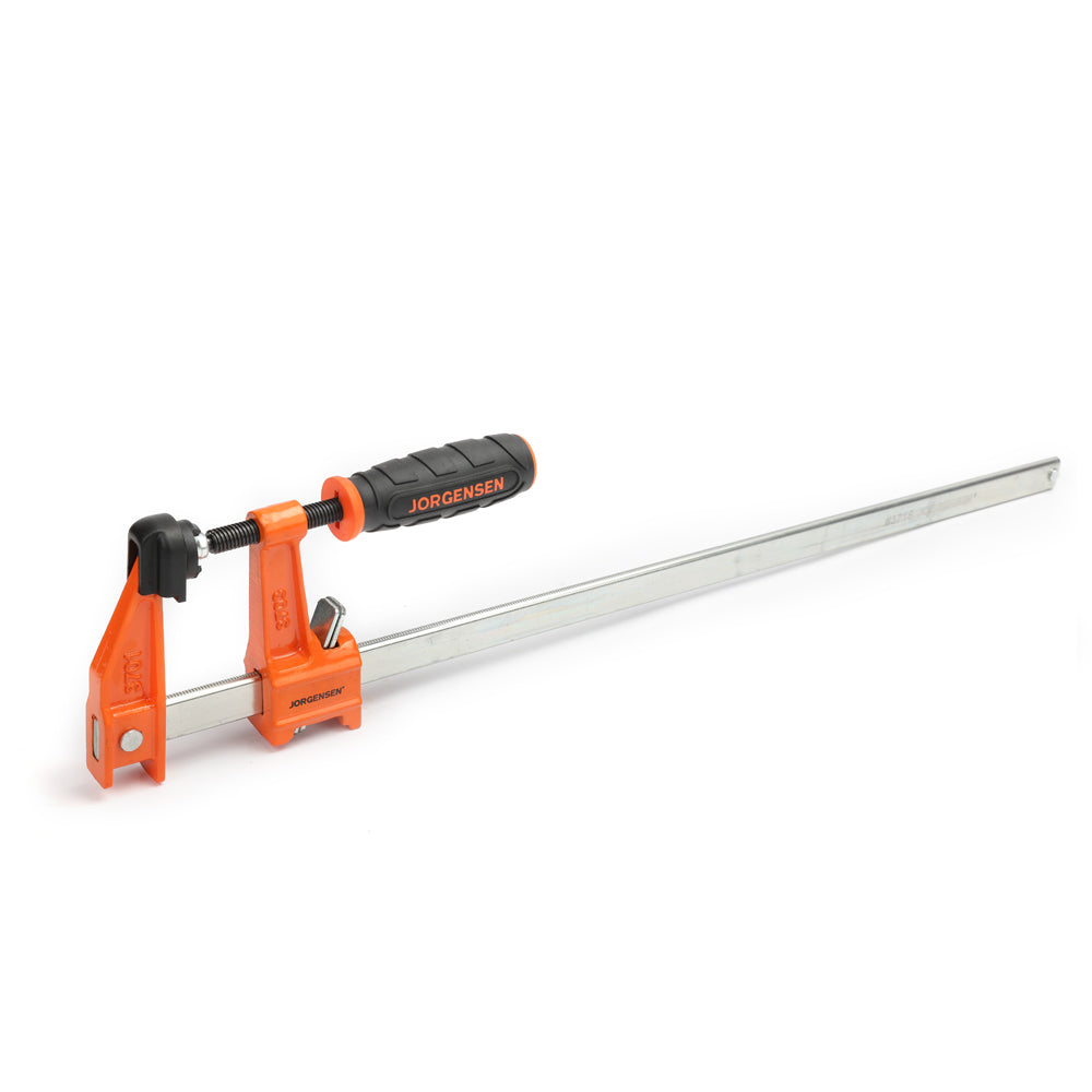 The Jorgensen medium duty steel bar clamp offers a sliding head making it a fast-acting, easy-to-open and close clamp. With an easy-grip handle and 38mm diameter plated steel swivel, this clamp can be tightened or loosened to meet your exact pressure needs. The multiple-disc-clutch design allows the sliding head to hold securely at any point along the bar. Each clamp has a 63mm reach and a 600 lb load limit. The clamps are plated to be rust-resistant. The iron casings have an orange baked enamel finish. These clamps are designed for use by dyers, hobbyists, carpenters, cabinet makers, woodworkers, metalworkers and professional trades people of all types.