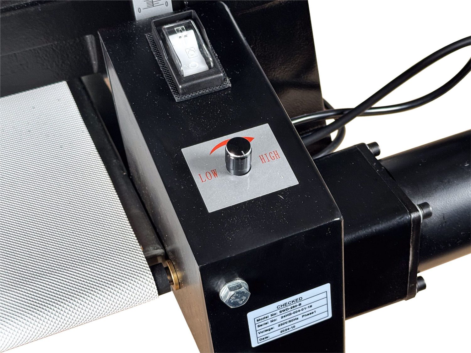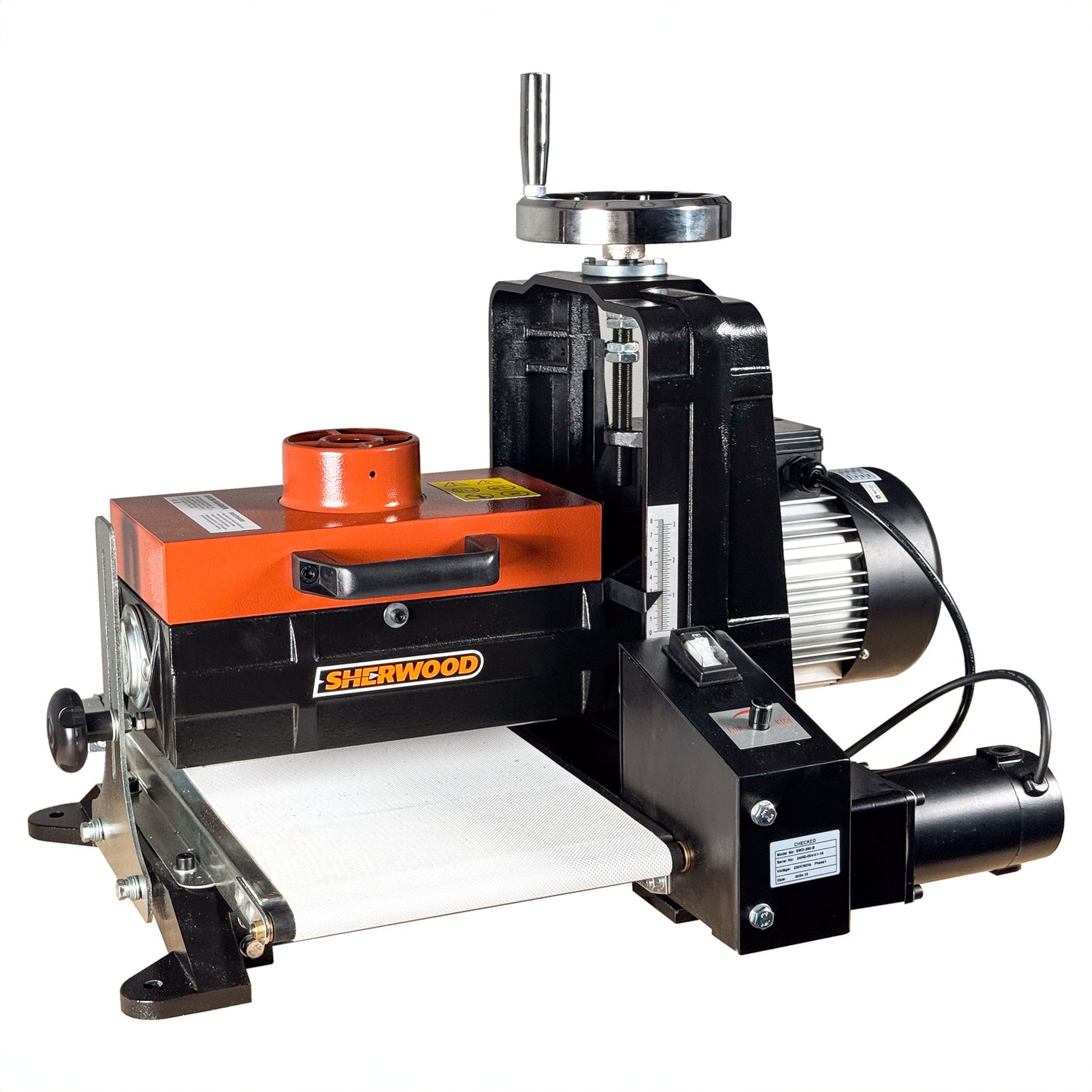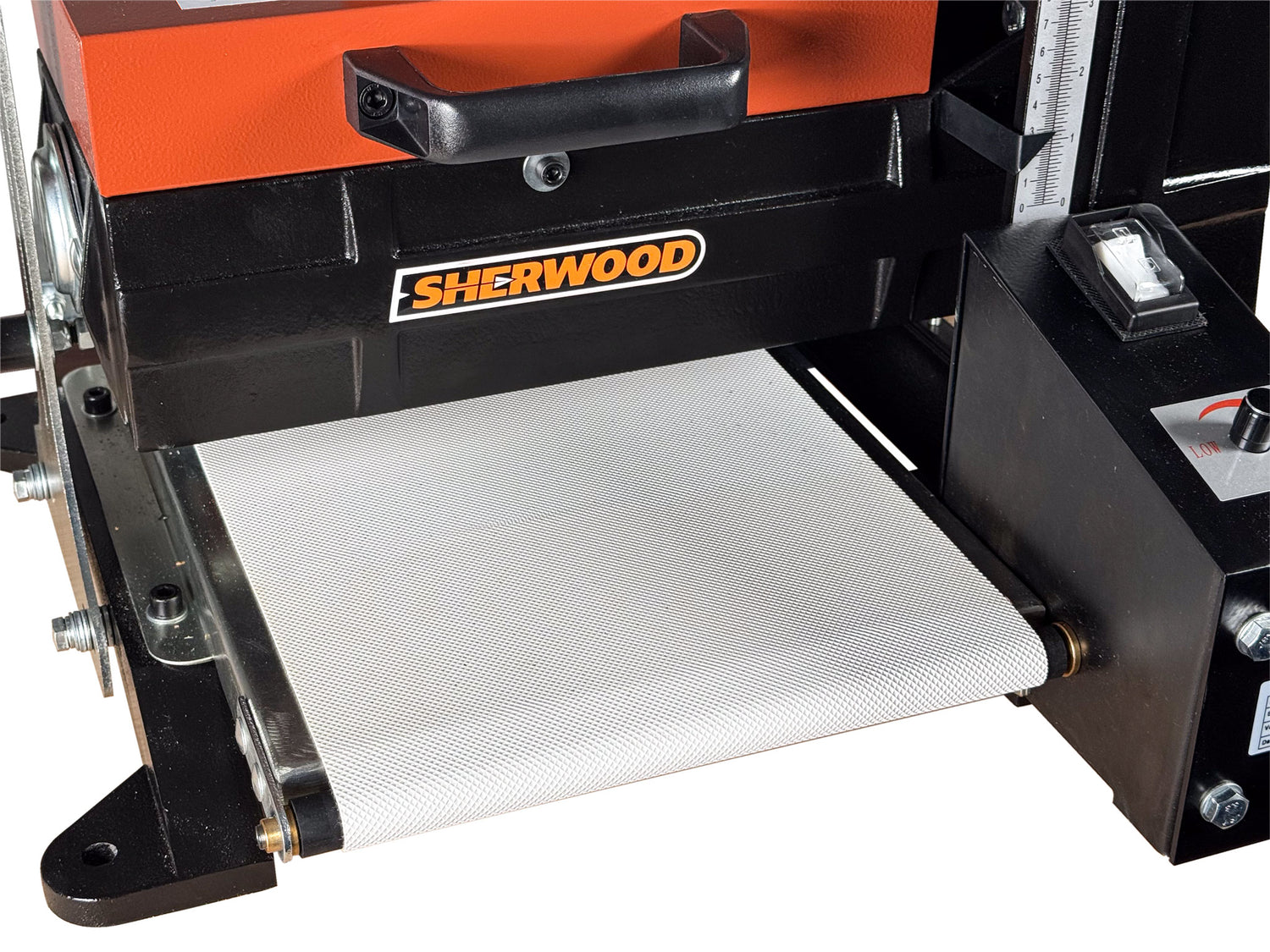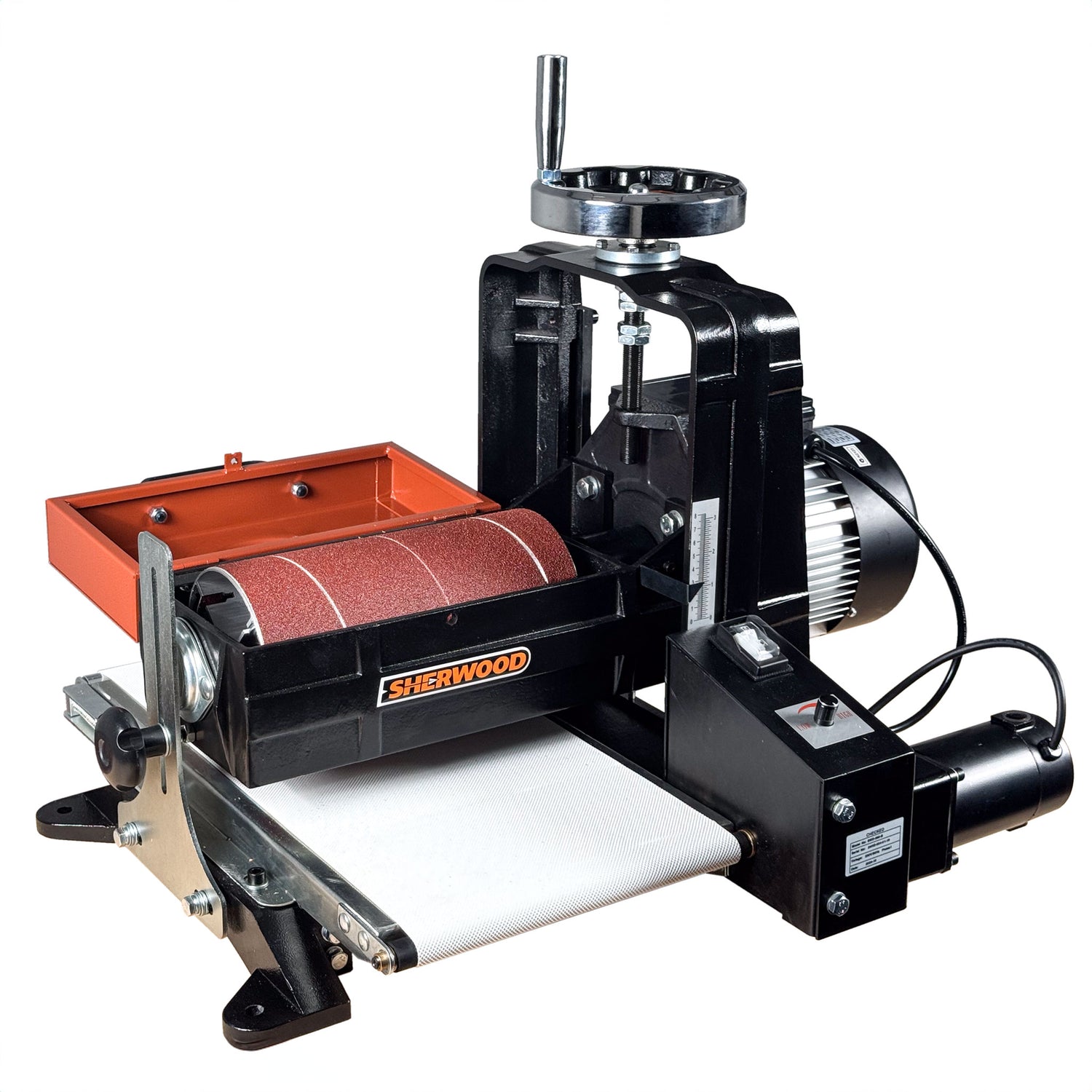 The Sherwood 10in Drum Sander features adjustable conveyor table speed rates. This means you can adjust the rate of feed into the sander to suit the parts you are completing. Feed parts through quickly when skimming or sanding narrower softwood parts, or slow the rate of feed right down so you can sand wider boards and cranky hardwood without burning the surface.