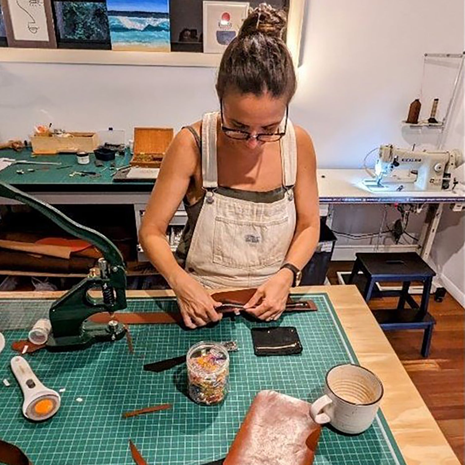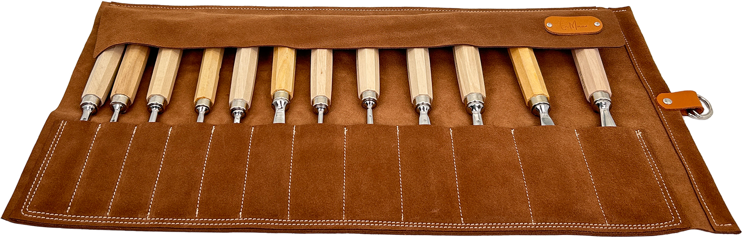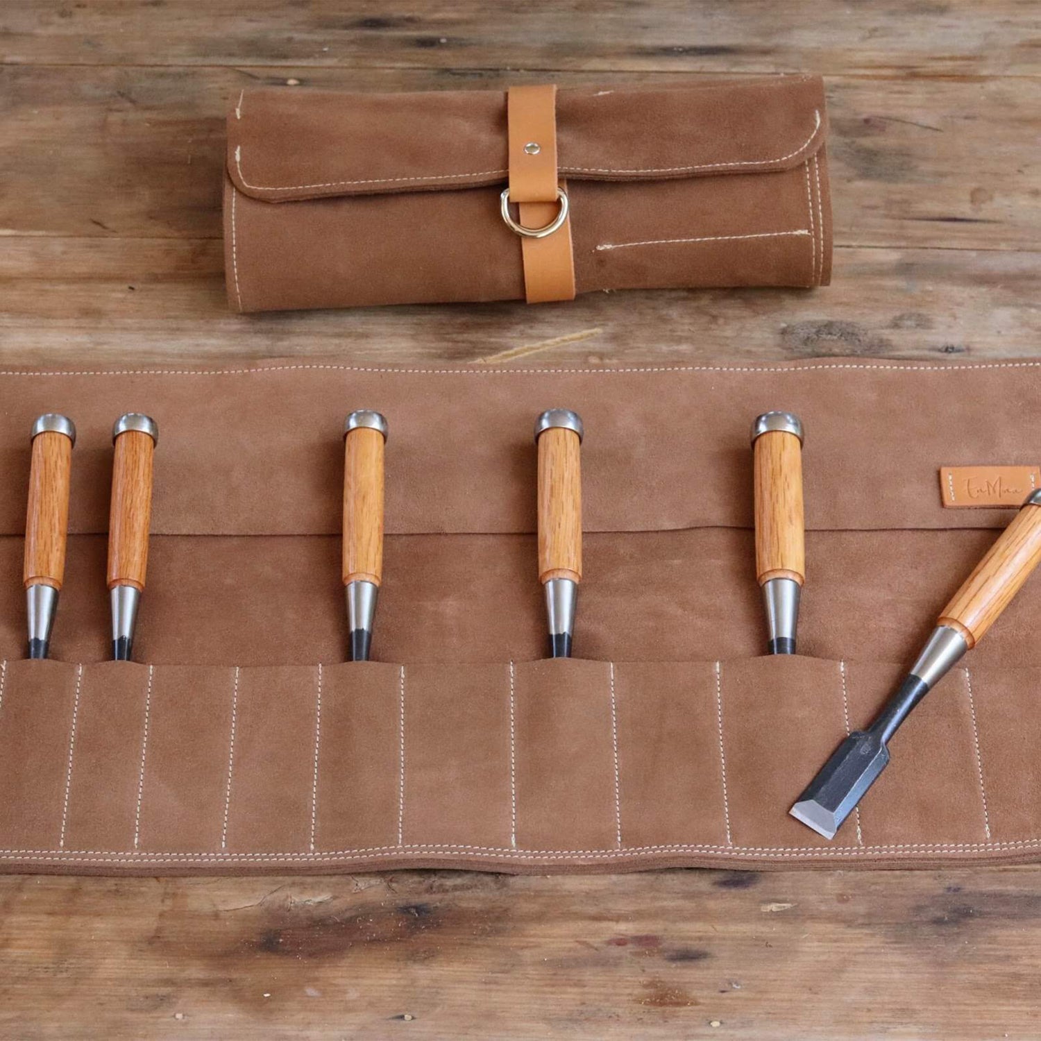 Handcrafted in the Sunshine Coast, this chisel roll has pockets for up to 12 chisels in a thick high quality cow suede. Featuring a leather strap and D ring closure, a third layer has been added to the bottom edge so your chisels are less likely to cut through the seam.