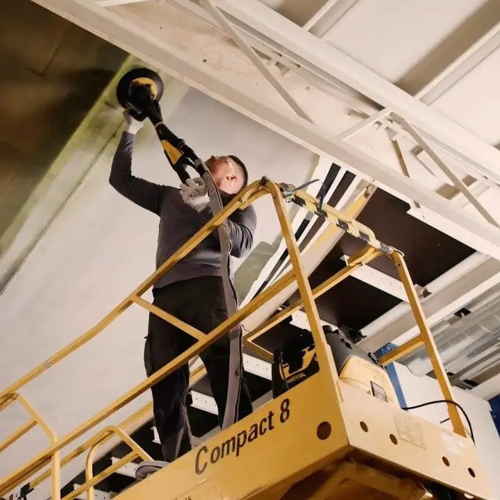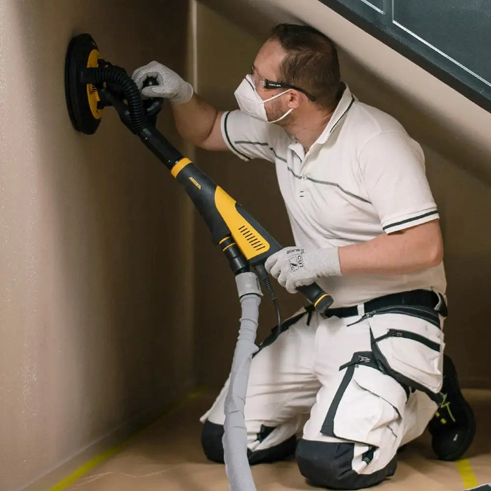 The lack of springs and brushes combined with dual suction means there is no need to press the tool against the wall when sanding with the Mirka LEROS-S. Instead, the complete force is transferred to the sanding head removing the weight from the user's hands, and reducing fatigue.