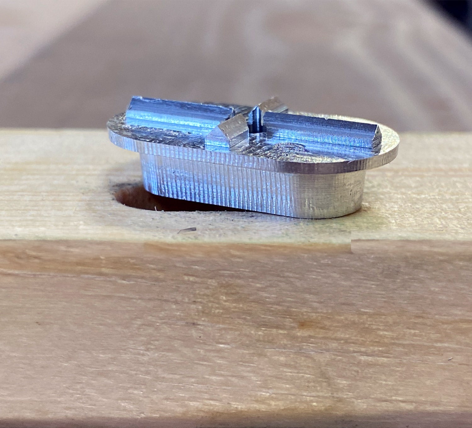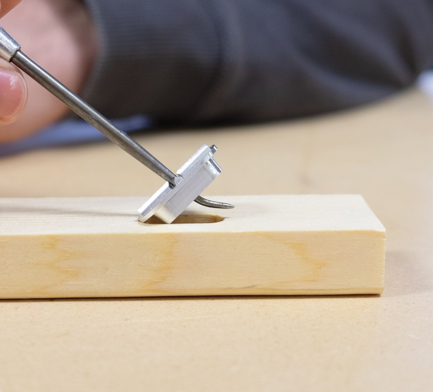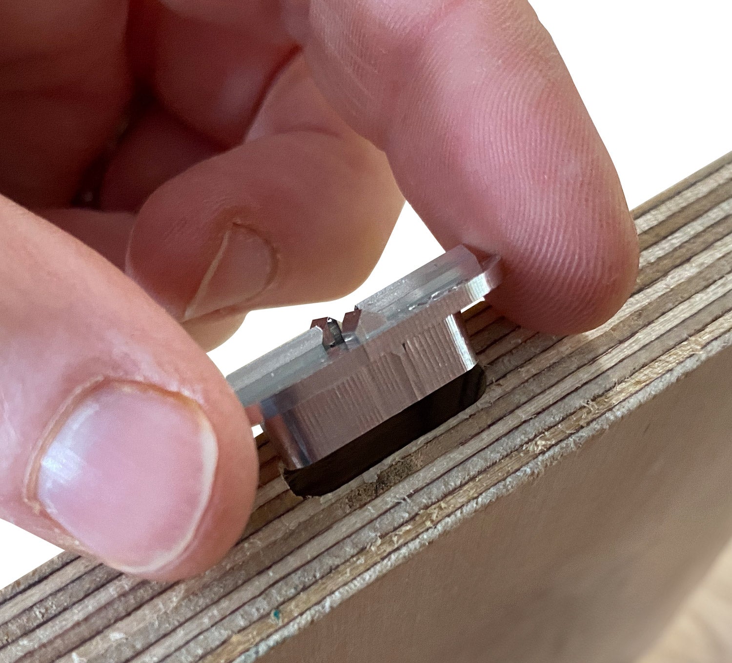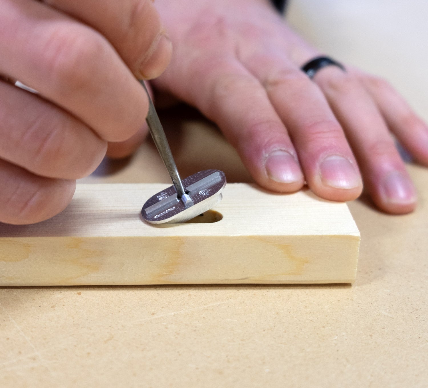 Simply slide the marker into an already cut mortise on one piece. Line it up where you want it to mate to your other piece, and tap with a hammer. The Mortise Marker will leave a cross-hair mark on the mating piece that you can extend with a pencil line, allowing you to make your mating cut perfectly and quickly every time. A 5-degree taper creates perfect centring in an existing mortise hole. For very hard woods, a stamp pad may be used to ink the mortise marker to aid in easily transferring your centre mark.