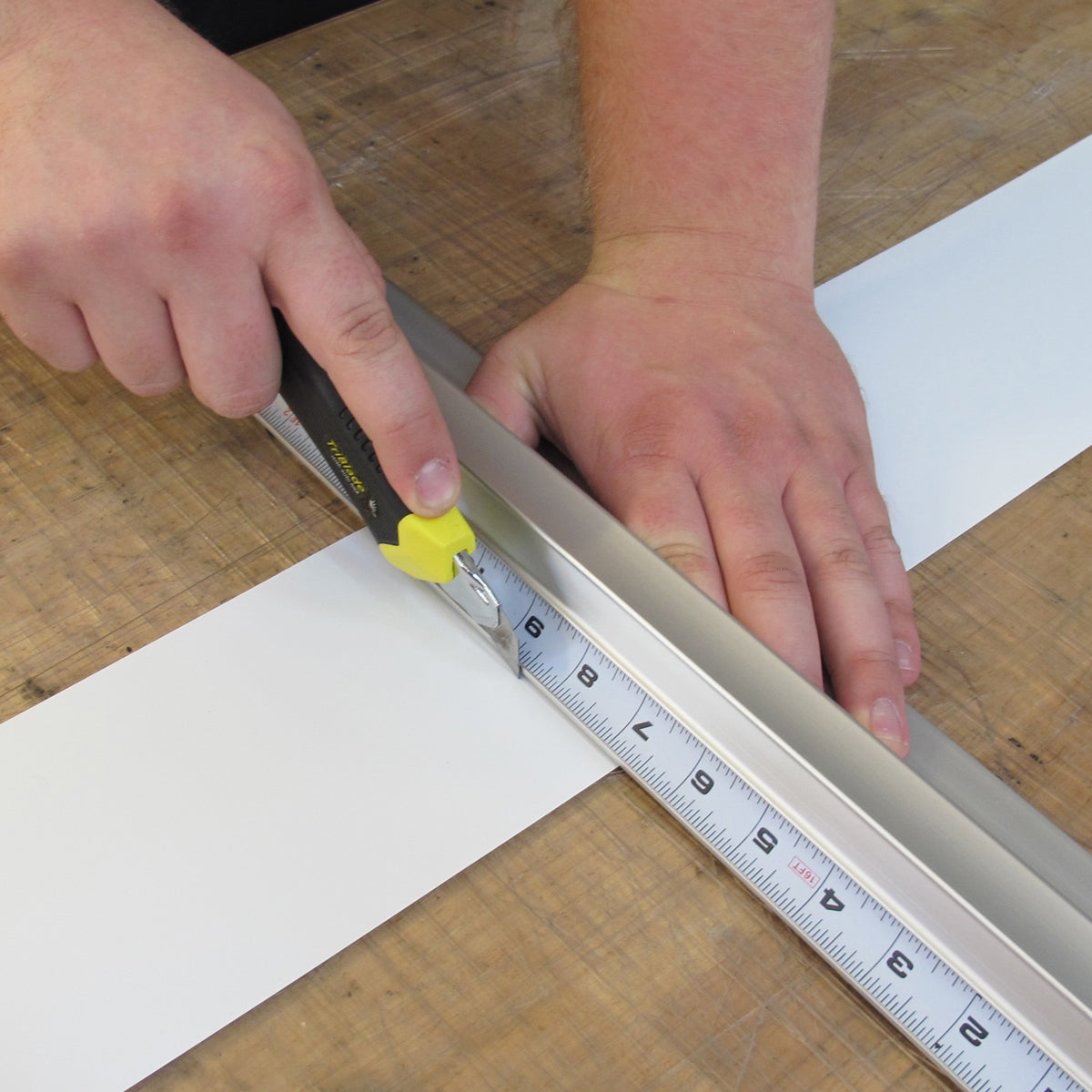 The SafeCut Ruler is the smartest and safest way to cut materials. The profile design makes it nearly impossible to cut yourself with a utility knife - Our you can use the SafeCut Mouse or Izzy's Track Guide for exact cuts along the edge.
