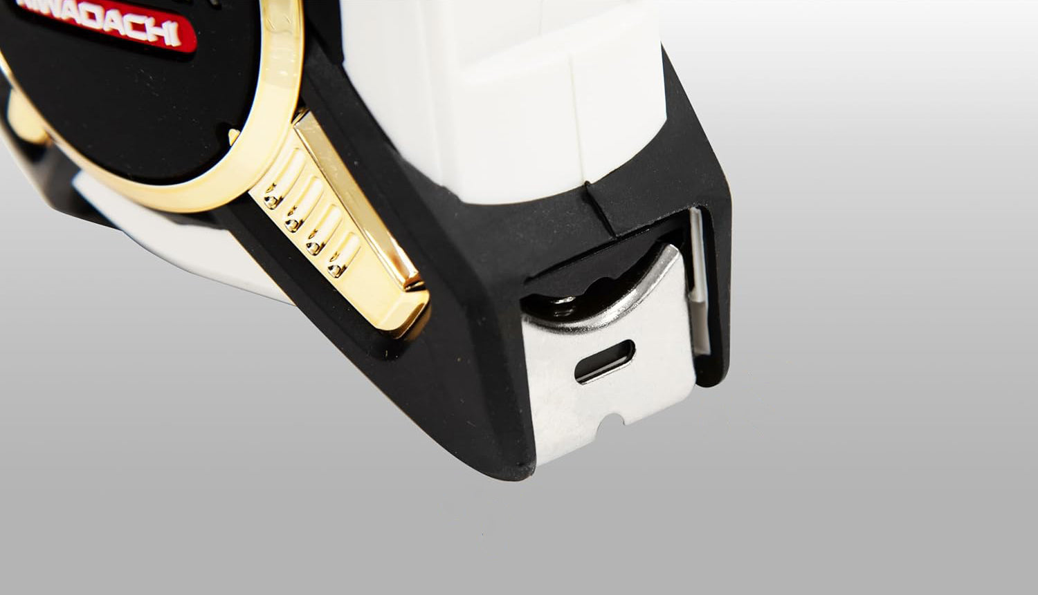 The tape itself is 25mm-wide carbon steel with a white baked finish and protective nylon coating. This makes it scratch resistant and will give a standout of 2.2 to 2.4 metres.