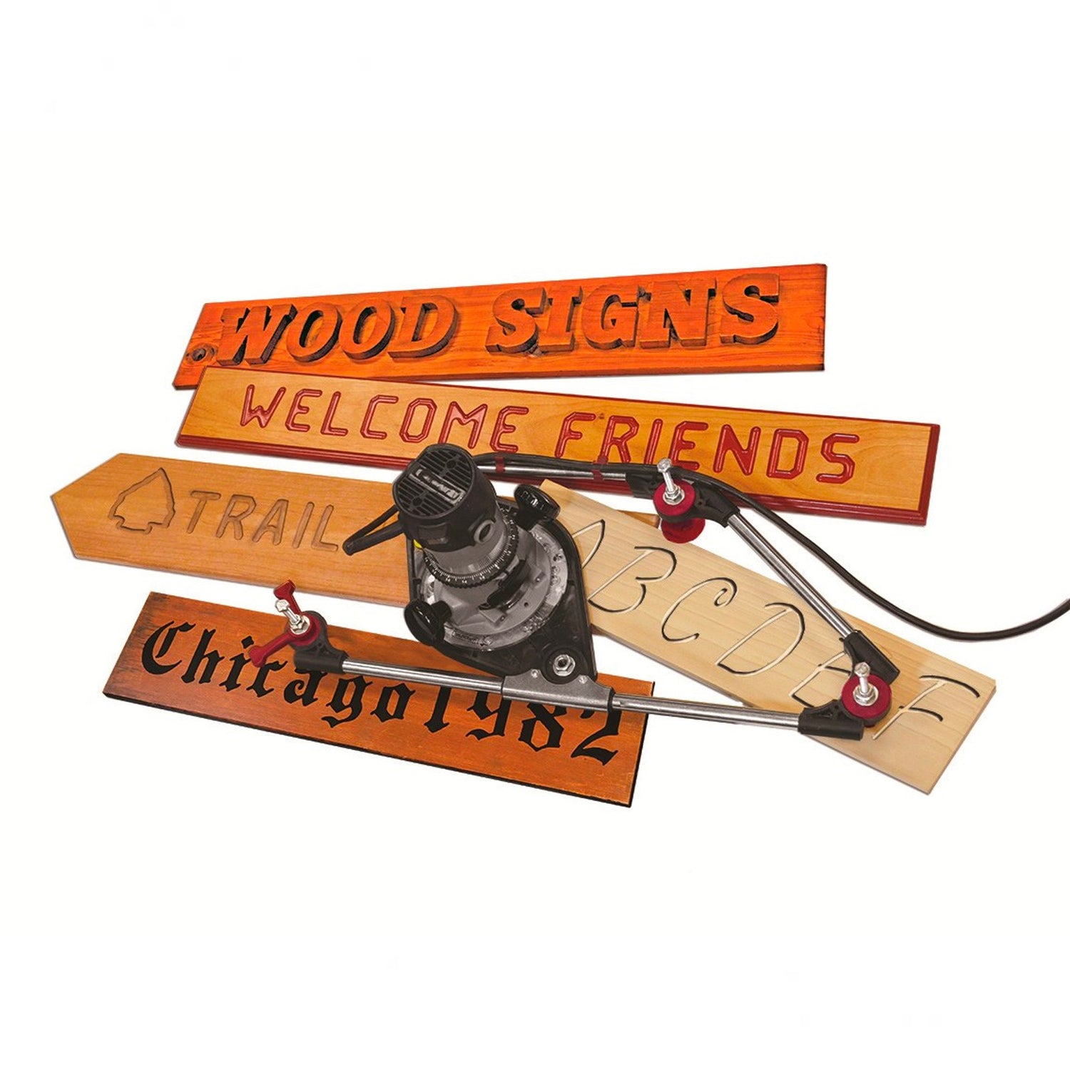 - Trace along any letter stencil or line drawing, while your router makes the same cut at a 50% ratio reduction