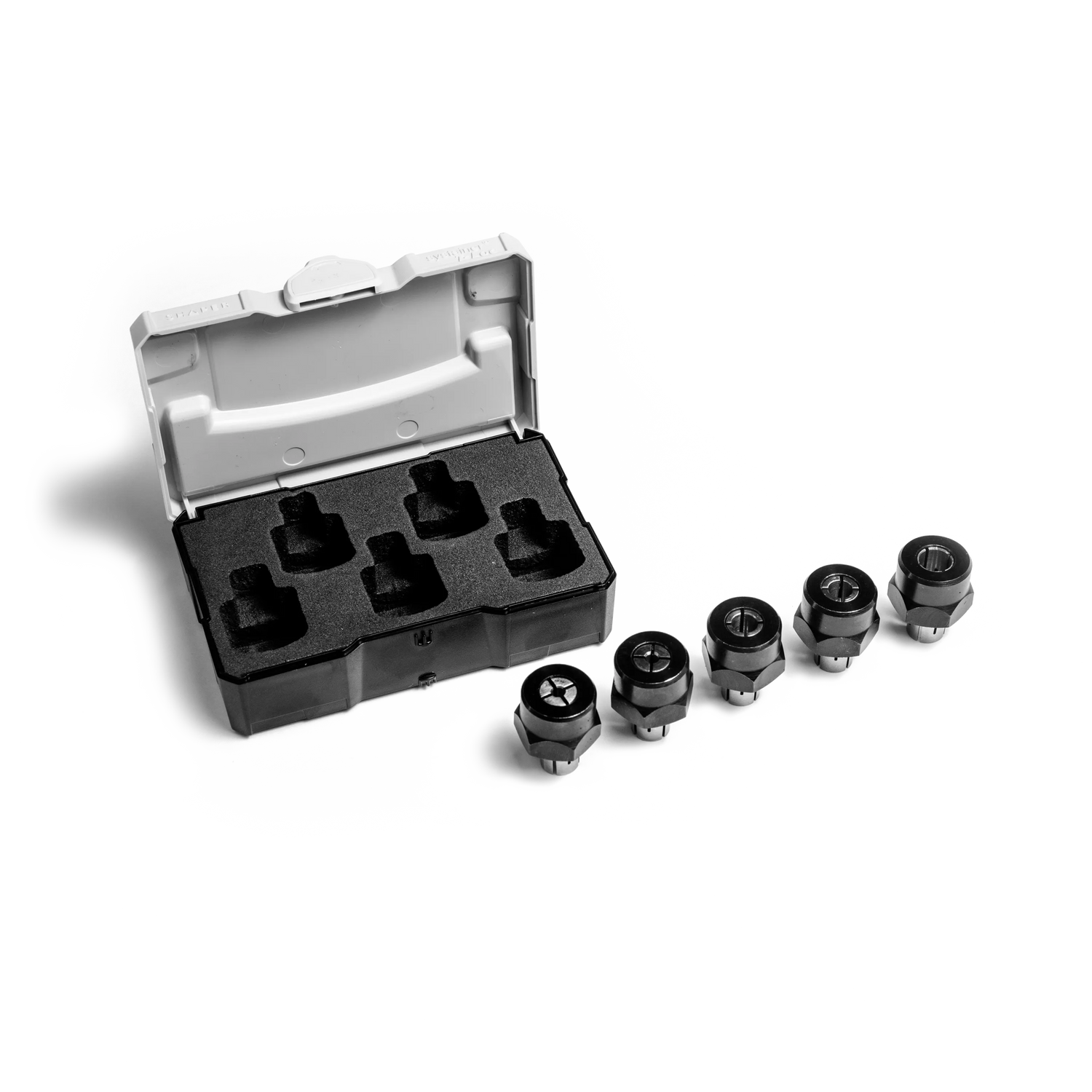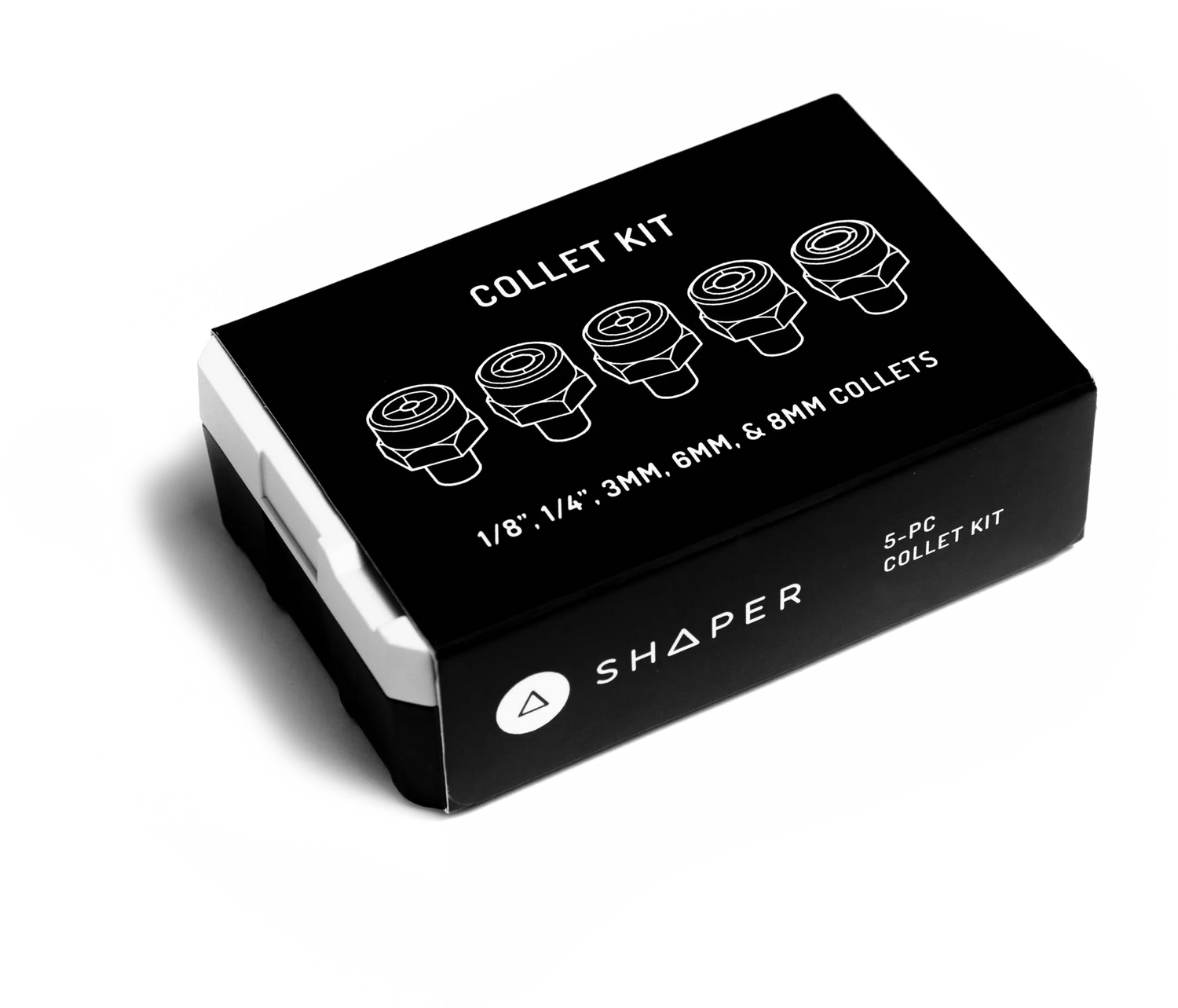 Shaper's Complete Collet Kit includes all basic collet increments in imperial and metric measurements up to 1/4in and 8 mm respectively. Every project starts with the right cutter and a collet that's designed to accommodate it. Don't rely on after-market adaptors or approximations that can jeopardize your cut quality, cutter and project.
