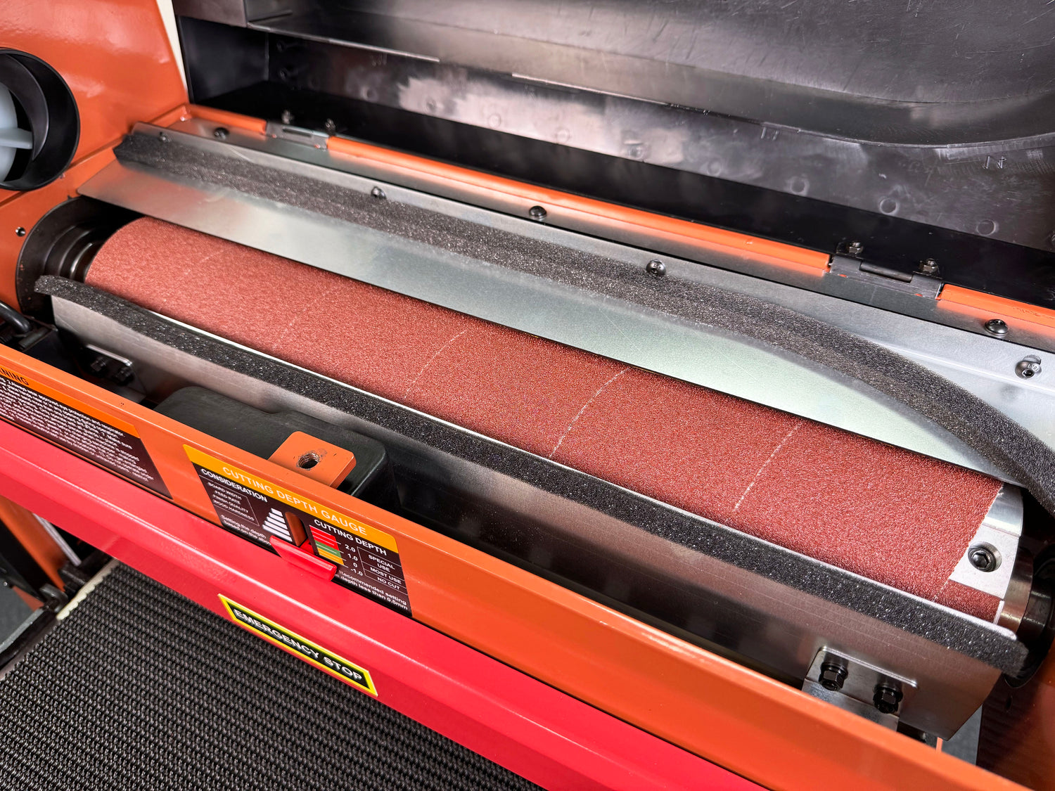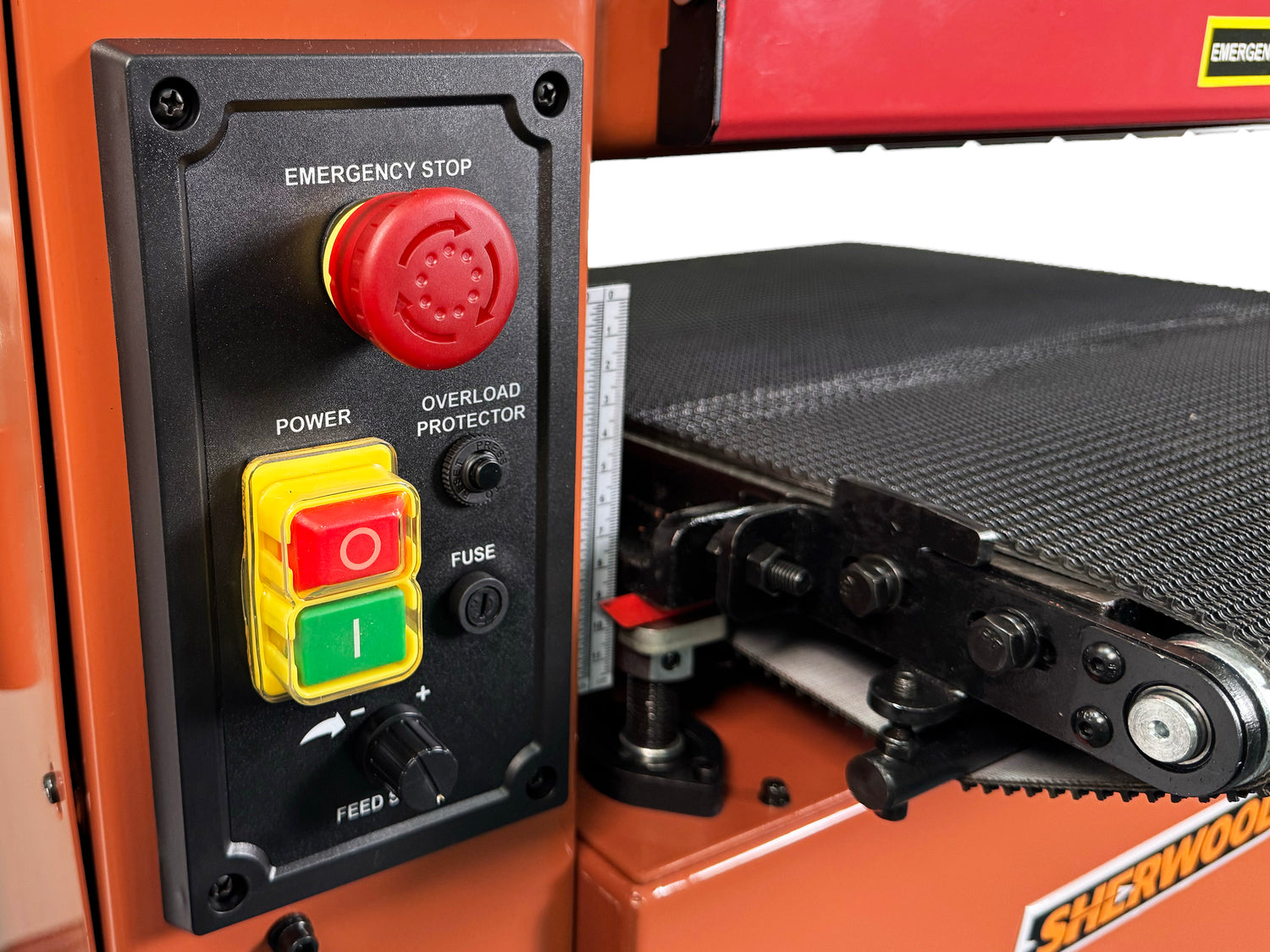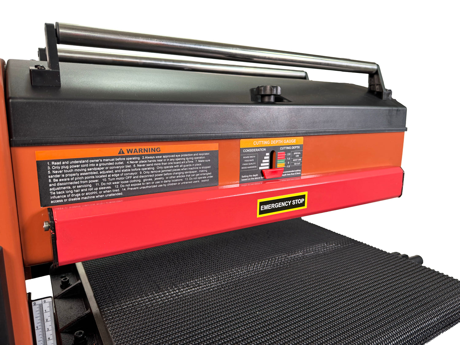 This drum sander features a both an emergency stop switch and a prominent emergency stop panel. The emergency stop panel is handily located at the material infeed point for quickest possible access in the event of an emergency. If you ever get into trouble with a piece of loose clothing or by trying to sand too deeply in one pass, the emergency stop switch or panel will halt the machine.