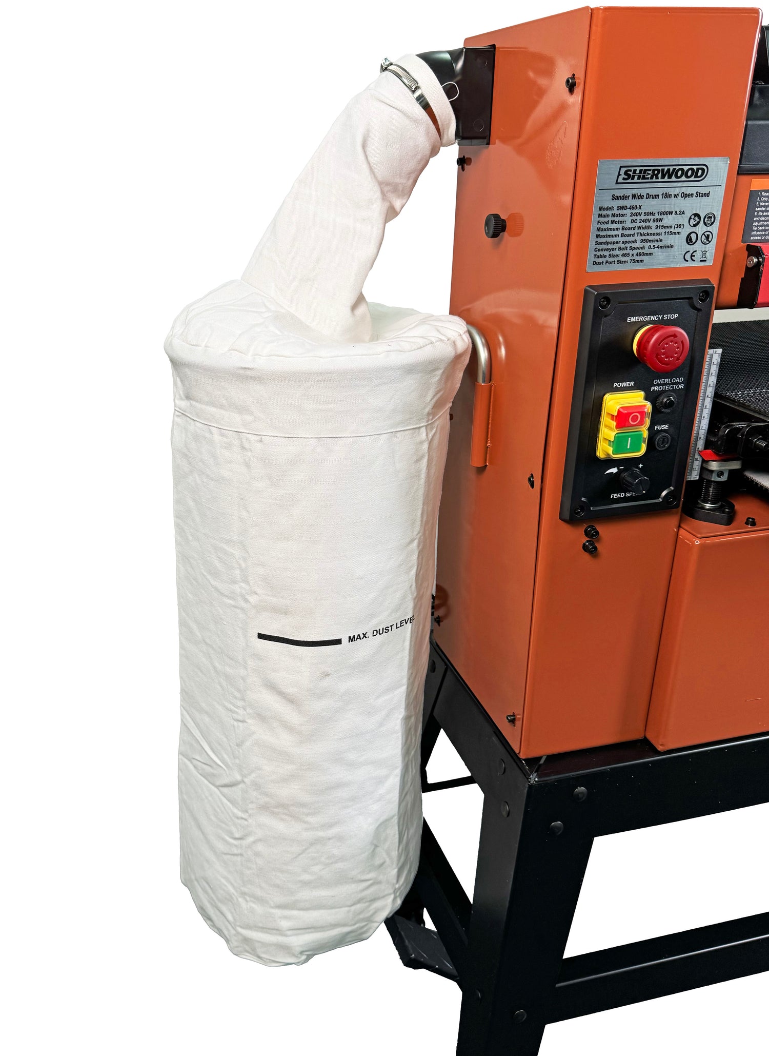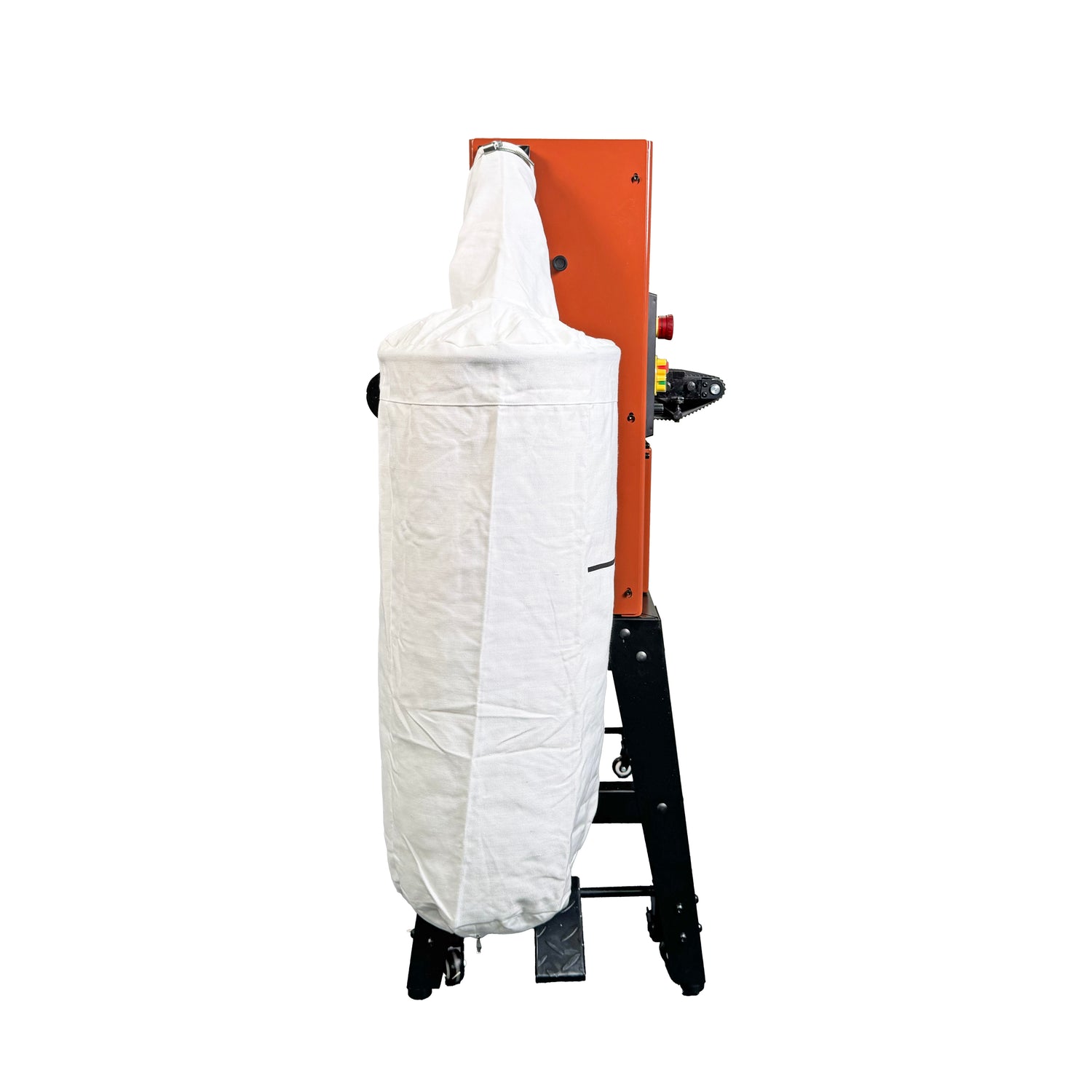 Included with the machine is a reusable felt dust collection bag to be mounted onto the filter bag support. This support is an upgrade that gives the filter bag maximum, uninterrupted air flow and extraction capabilities. For best results, it is highly recommended you attach your drum sander to a motorised dust collector or shop vac.