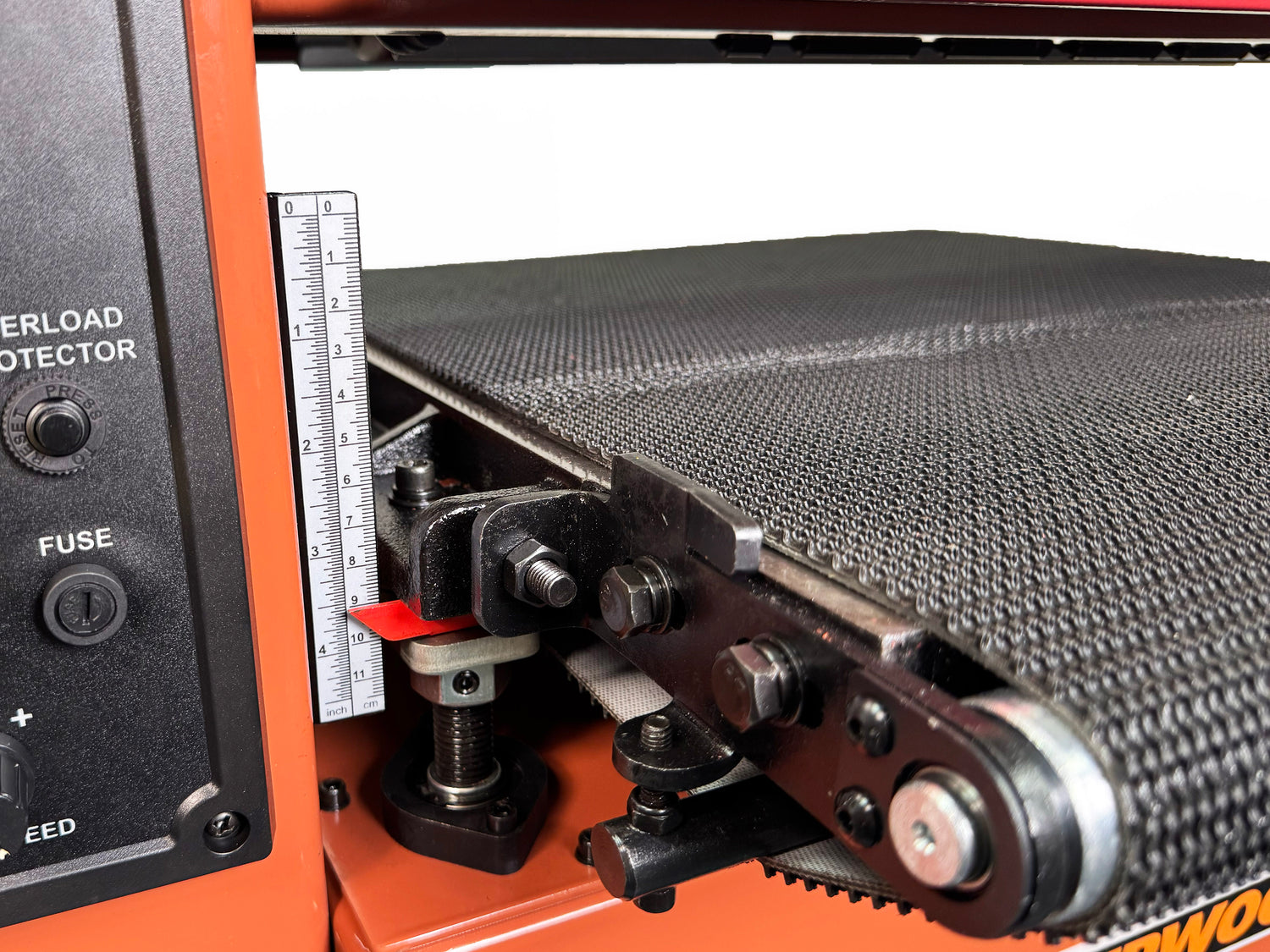 A cutting depth gauge located on the centre of the machine above the infeed point reads out the exact amount being removed by the drum sander as your workpiece is passed through, including when the material is not being engaged. The height adjustment hand wheel is very responsive, allowing the table height to be adjusted very finely. Each full turn of the hand wheel raises the conveyor table only 2mm. There is a locking knob located on the front of the machine to fix the height position securely. Together these features create a vibration free and precise drum sander providing you with super smooth, uniform results.