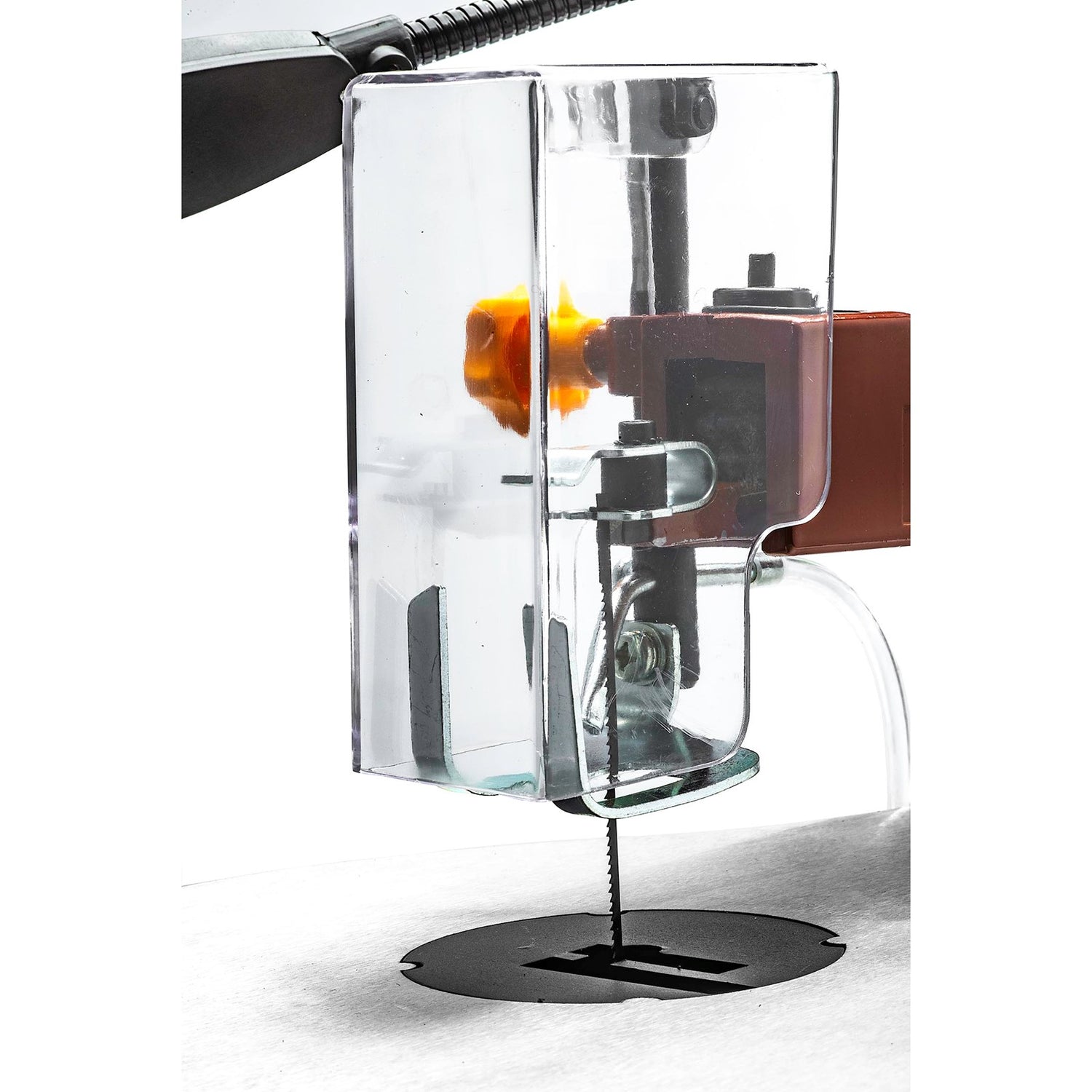 Adjustable Dust Blower and Safety Clamp: Keeps the cutting line clear of debris and secures the workpiece for added safety.