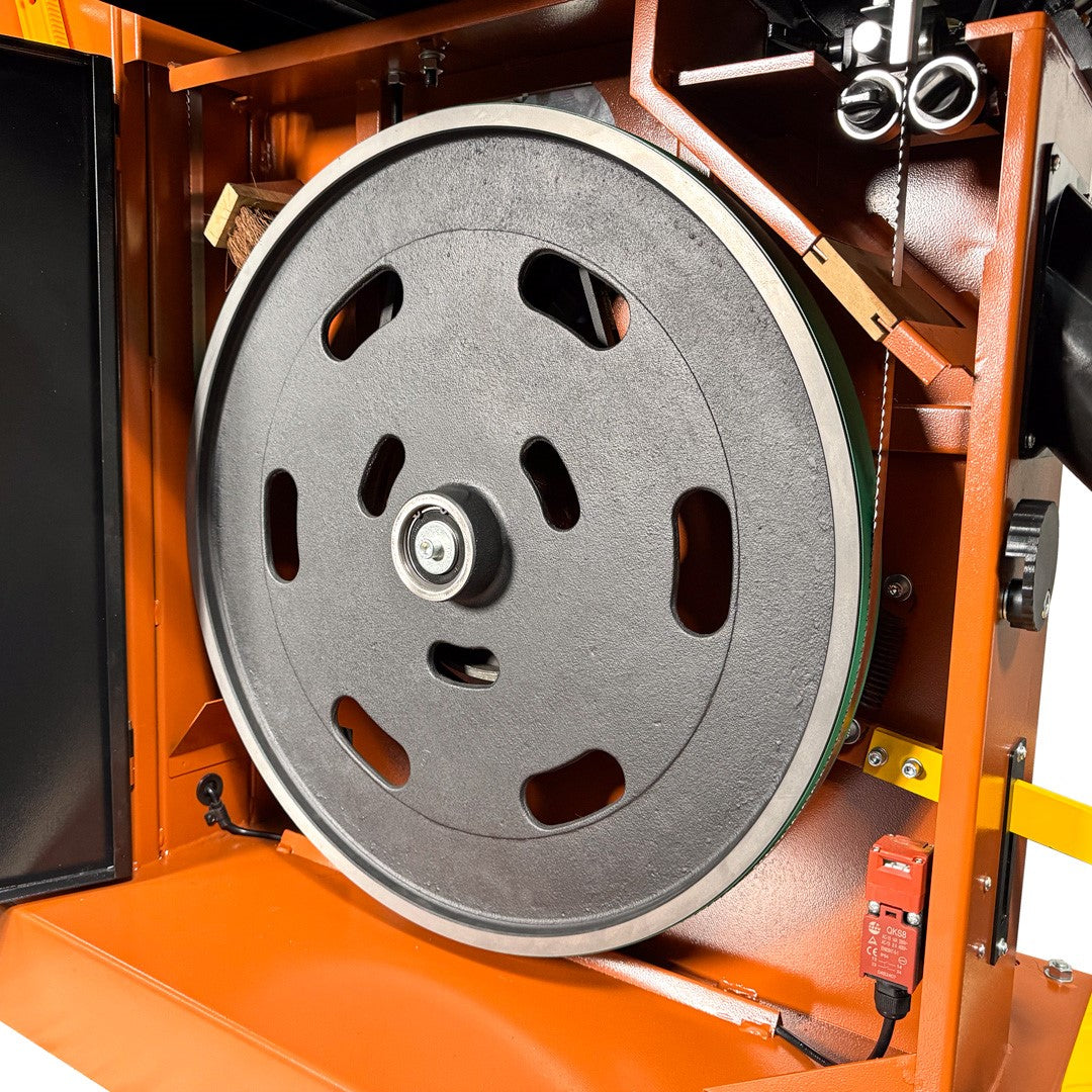 The Sherwood 24in Industrial Bandsaw is a serious work horse. The massive three-phase 4000W 5HP+ induction motor powers the blade at 1500 metres per minute, allowing for fast feed rates in hard timbers. Precision-balanced cast iron wheels contribute significant rotational inertia, smoothing out variations in motor load.