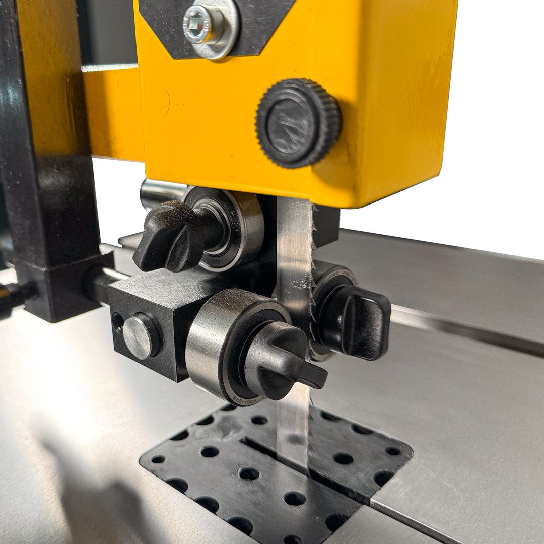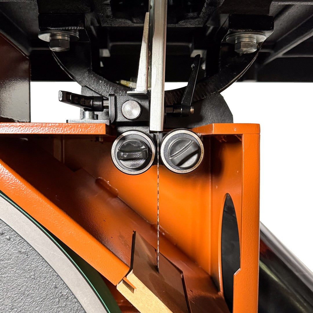 The Sherwood 24in Industrial Bandsaw features upper and lower solid American-style bearing blade guides. These smooth-running sealed bearings are easy to adjust and very durable, and ensure that the blade stays on track even in the most demanding cuts. Just tune your bandsaw and go. The top blade guide assembly runs smoothly on a rack and pinion assembly.