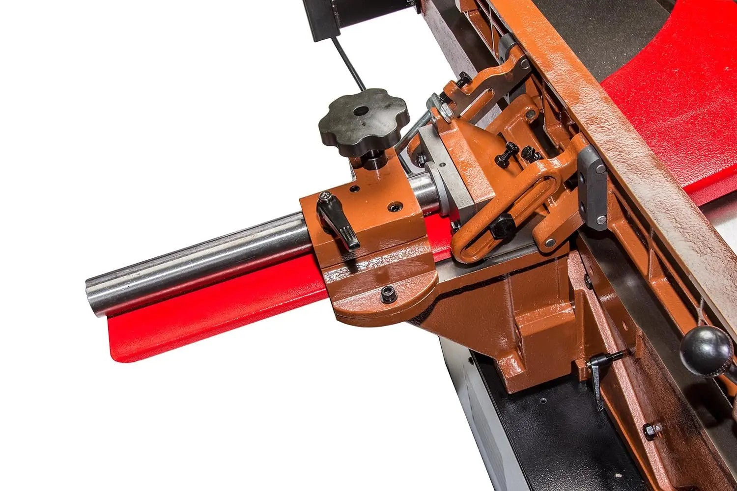 Unlike most machines that extend the outfeed side, this jointer features an extended in-feed fence—ideal for supporting long workpieces right where it matters most. The fence is mounted on a heavy-duty cast-iron bracket for excellent stability.