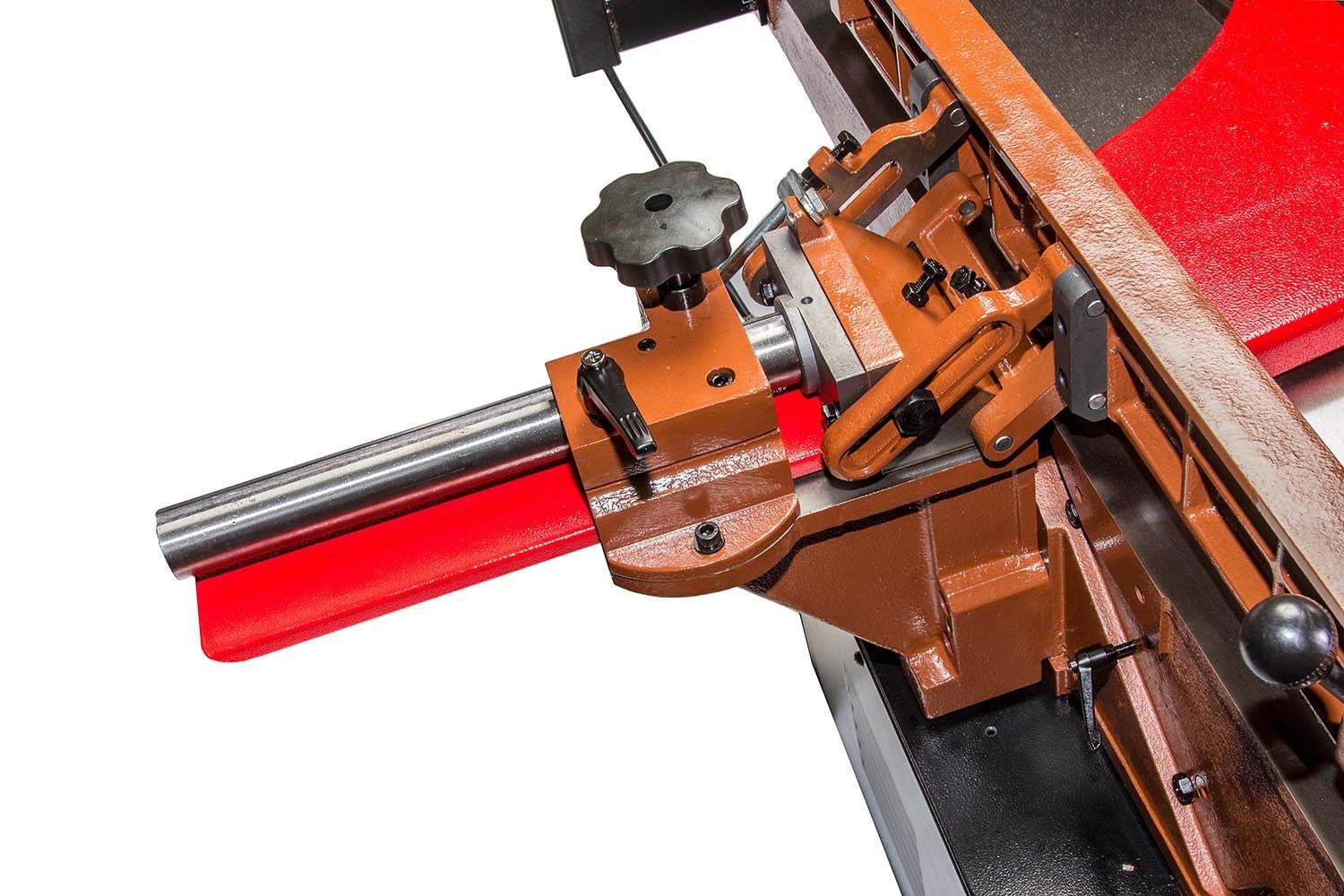 The high fence is mounted on a solid cast-iron bracket, offering excellent support for edge planing. Easy-to-use rack and pinion adjustment locks the fence securely in place and allows tilting up to 45°, with integral stops at 45° and 90° for fast, precise bevel cutting.