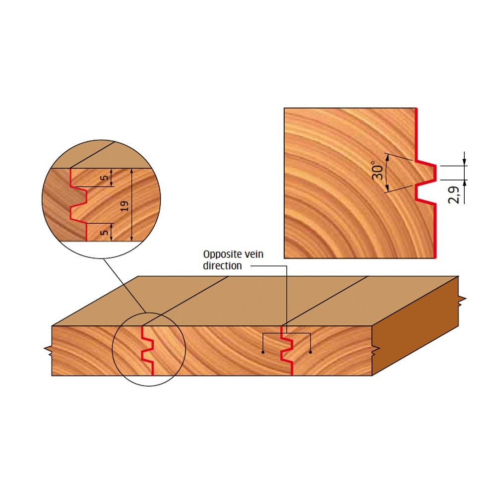 The Reversible Glue Joint Bit provides a very strong joint for edge-gluing applications by increasing the surface area for glue. Once the boards are planed to a uniform thickness; align bit to the centre of the board, then reverse each board for a perfect glue joint. An ideal joint for raised panels, drawer fronts, table tops or any glue-up application. For use in hardwood, softwood or composites on CNC or table-mounted routers.