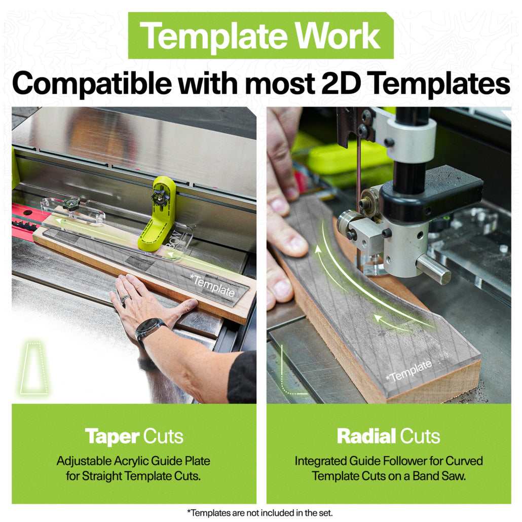 - Versatile across tools: Optimized for both table saw pattern/taper work and precision bandsaw guiding.