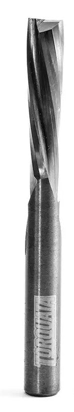 Torquata solid carbide spiral bits begin life as extra-hard C4 micro grain carbide, ground using sophisticated 6-Axis C.N.C. to grind their spiral geometry. The precision of the spiral and hardness of carbide allows for a very sharp edge and typically longer edge sharpness. A straight bit can't compete with that. The geometry and top point allow you to plunge into your work like a drill, using a constant shearing action when making the cuts.