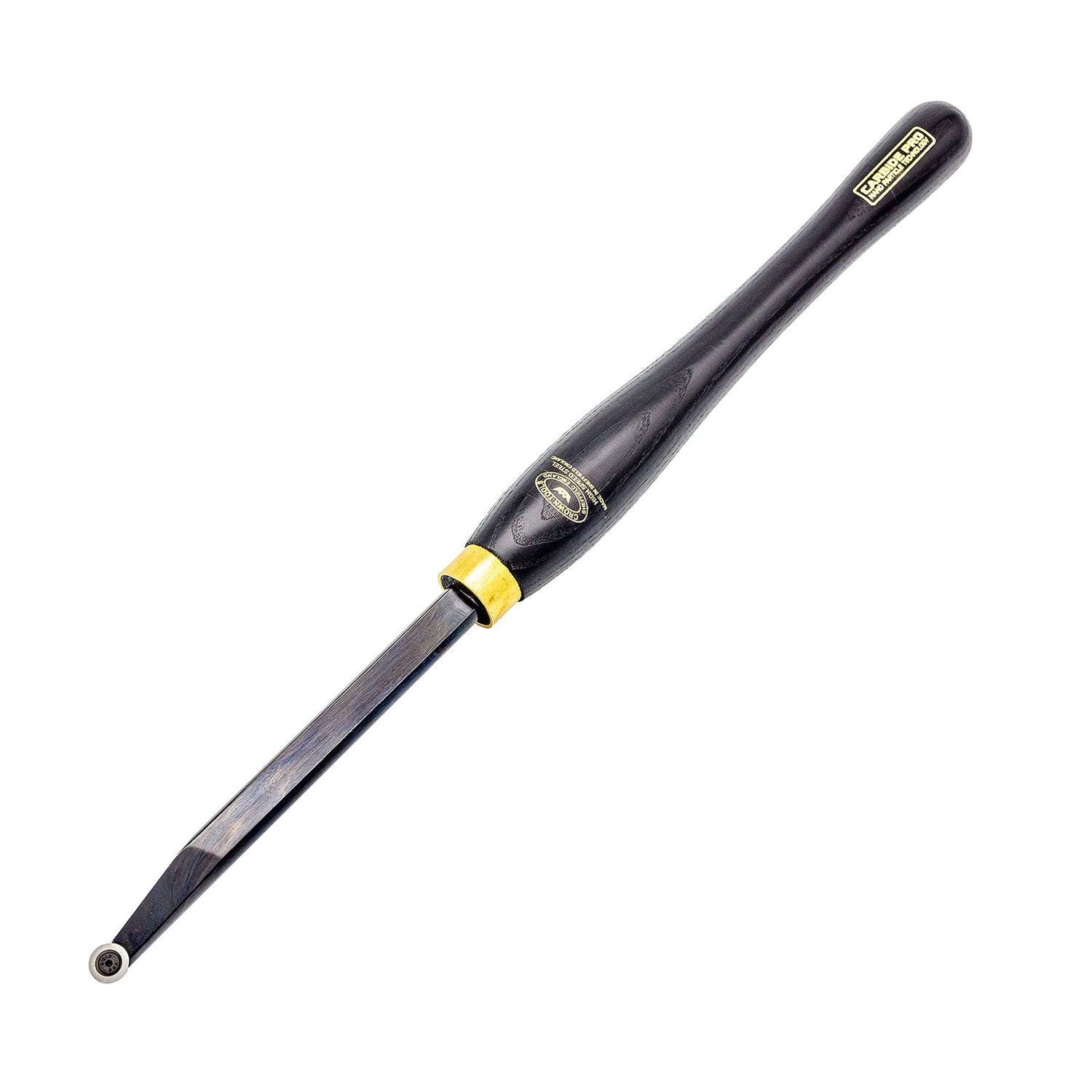 The tool is supplied with a 430mm (17") black stained Ash handle and a super sturdy 215mm (8.5") long x 15mm (0.6") wide Chrome Vanadium steel blade. Together they give the tool a beautiful heft that both deadens vibration, and helps keep it on the rest. Like all similar tools, this tool is designed to work flat and level at or just below center. The blade edges are slightly rounded to allow controlled shear cuts when desired. The Round cutting tip is 15mm in diameter. The Tool has an overall length of approximately 570mm (22.5"). Includes the Tool, a Carbide Cutting Tip & Screw, a Hex Wrench, and 2 extra Mounting Screws.