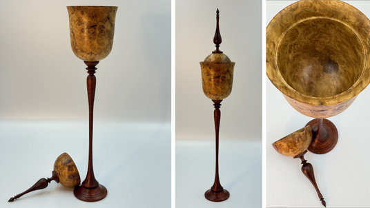 This piece is crafted with a focus on elegant proportions and precise assembly. The lid is shaped to sit seamlessly within the body, creating a balanced form. The long stem is turned from straight, close-grained timber, while the finial completes the composition with refined detail. Final assembly requires careful alignment to maintain concentricity between the components.