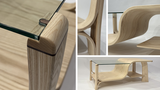 This coffee table embodies a dialogue between fluidity and structure, as a sculpted timber form transitions into a tempered glass surface. Inspired by wood grain and the contrast between transparency and solidity, it balances sculptural expression with everyday function. An interchangeable lower shelf – in timber or glass – adds versatility and aesthetic flexibility.