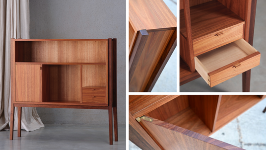 A cabinet for drinks or display. Solid Blackwood with shop sawn Blackwood veneer back panel and Port Orford Cedar drawers. The legs and frame under the cabinet are also Blackwood but from a different tree, giving a slight contrast.