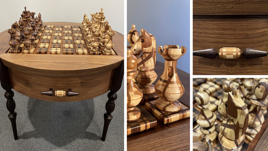 Plaid Gambit is a finely crafted chess table that reimagines traditional plaid as a bold three-dimensional form. Made from a mix of hardwoods, it blends rich tones with precise construction, balancing heritage and innovation.