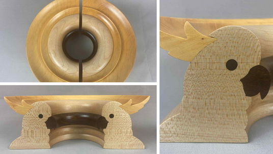 This cockatoo was created using the German ring-turning technique, where a donut-shaped form is turned and then cut to reveal a silhouette. The added complexity of segmented rings requires precise alignment and tight tolerances. Crafted from Rock Maple, Black Walnut, Huon Pine, and Ebony.