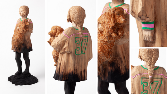 Carved in Himalayan Cedar with charring, black stain, paint, coloured pencil, ink pen, and sealer. The loose carving of the clothing contrasts with sharper lines to create emotional depth. Continuing a theme of environmental disasters, this piece reflects on bushfires and was inspired by burnt forests and the green shoots of regeneration in New South Wales – a familiar sight in the Australian landscape.