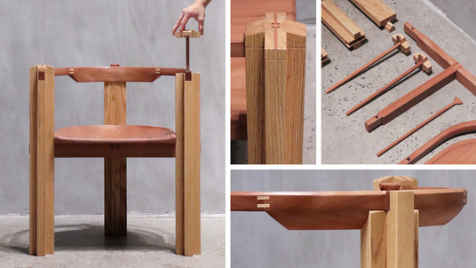 Crafted from Glacial Oak and Brushbox, the Pin Chair explores the traditional pinned mortise and tenon joint. Held together by three large pins running the length of each leg, it can be assembled and disassembled entirely without hardware.