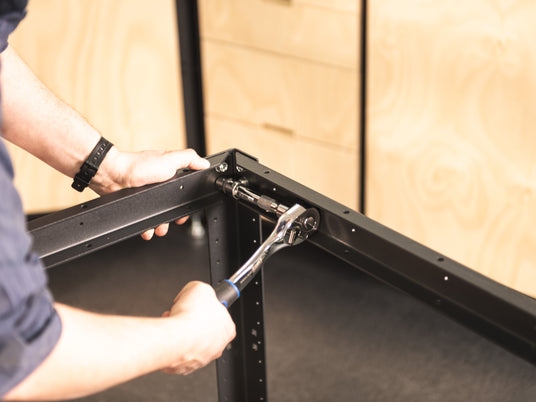 - Bolt each end frame subassembly together using ‘depth’ rails, checking that the frame is square. Leave the bolts finger-tight. Note – they are nylon-insert lock nuts and so they will be naturally stiff to install.