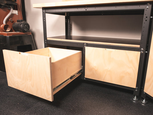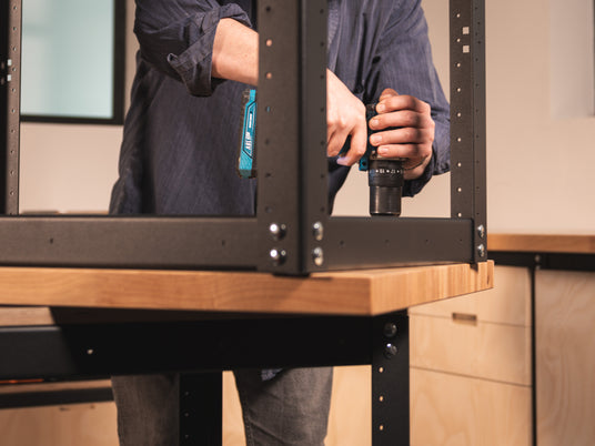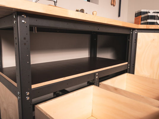 - For a standard shelf, you’ll need drawer/shelf rails of the same dimension as your ‘depth’ rails. You can fit these rails into any of the holes in the legs.