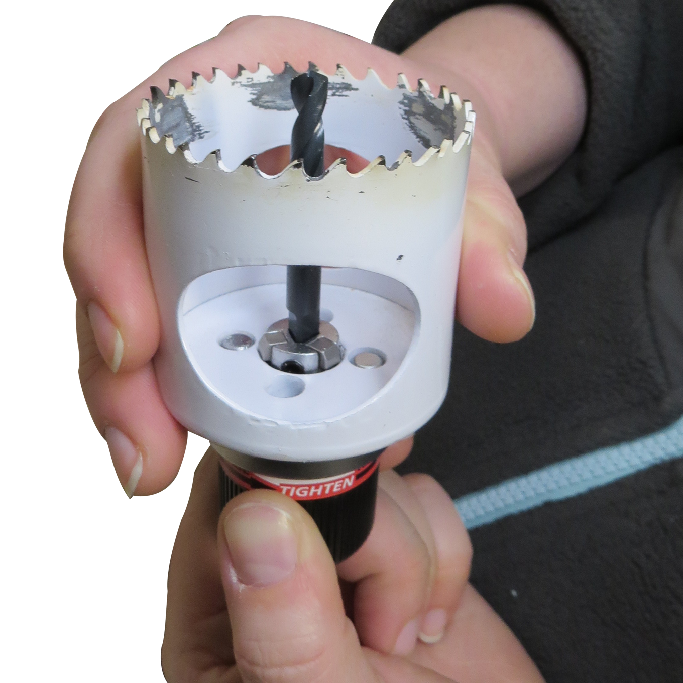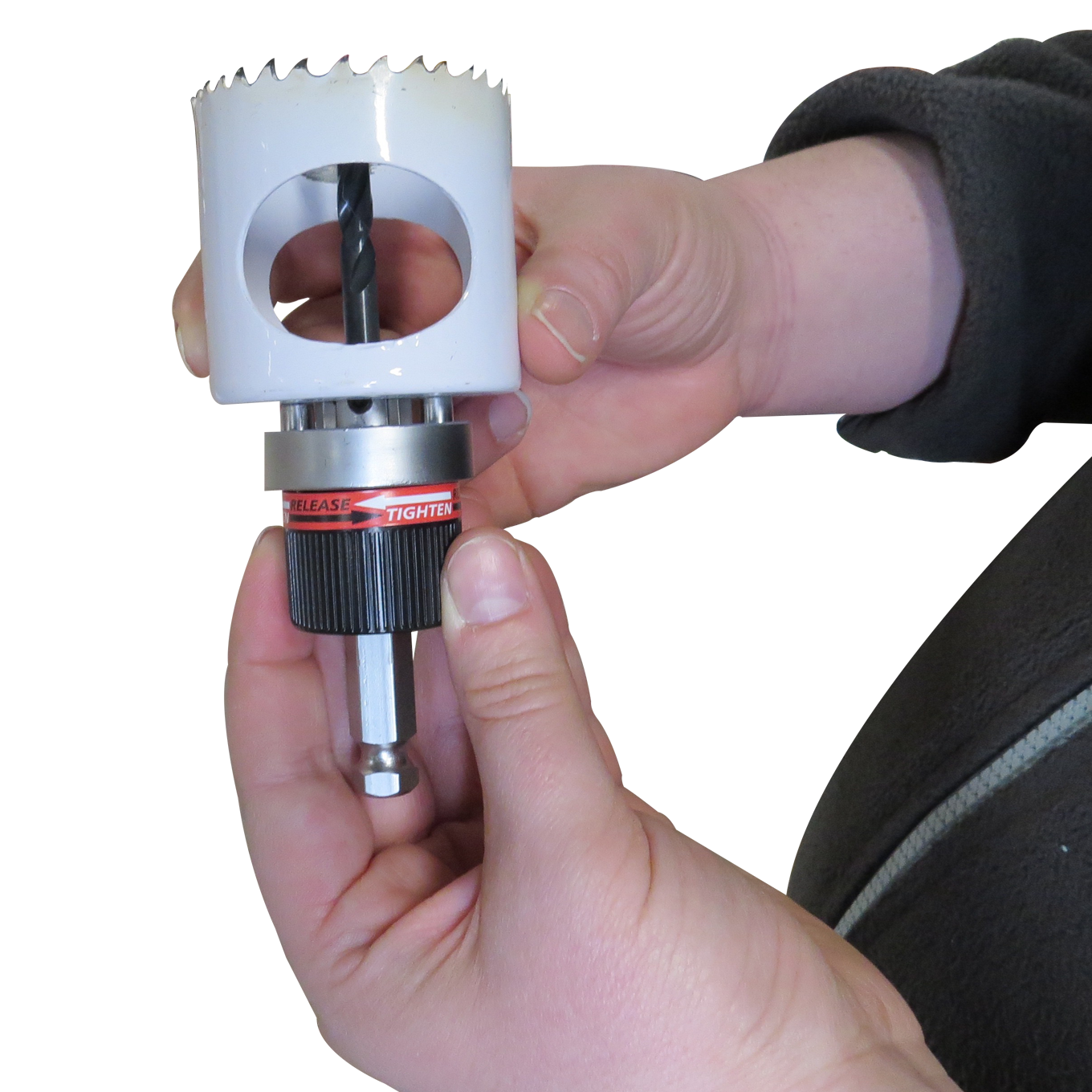 The Quick Mandrel, developed by a cabinetmaker, has a new quick-release system that allows you to easily lock and quickly release your hole saw. Line up the pins and push into place with a simple twist to lock your hole saw. Great for lock sets, quickly ‘roughing in’ plumbing and electrical, and for large diameter holes.