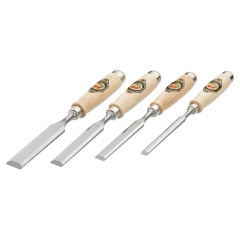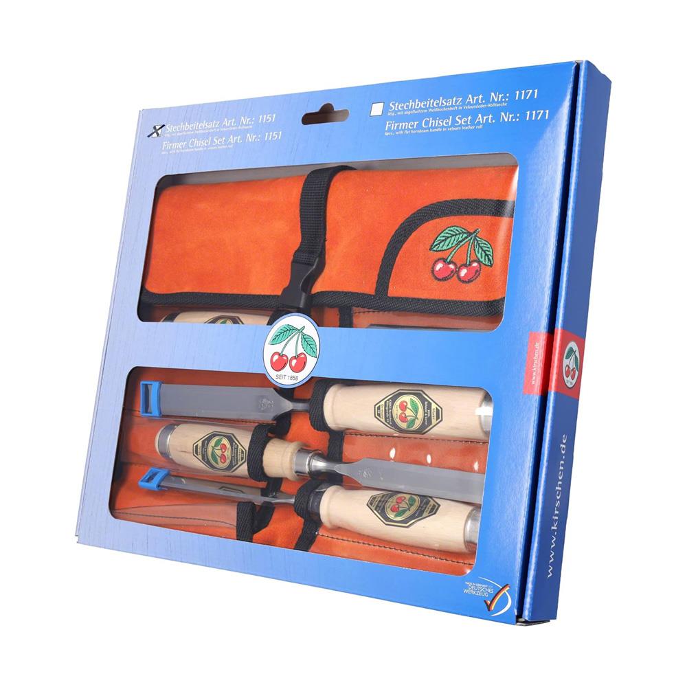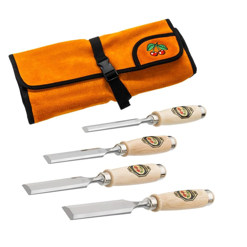 Kirschen Two Cherries Set of 4 Firmer Chisels Bevel Edge with Wooden Handles In Leather Storage Roll