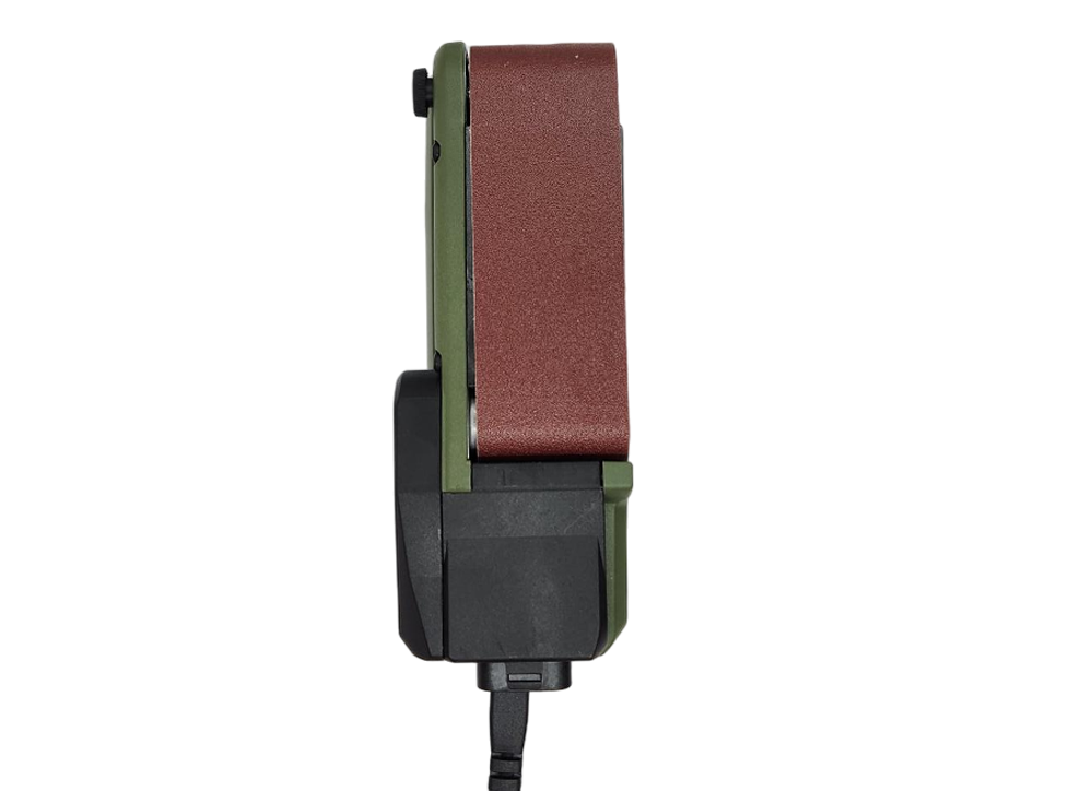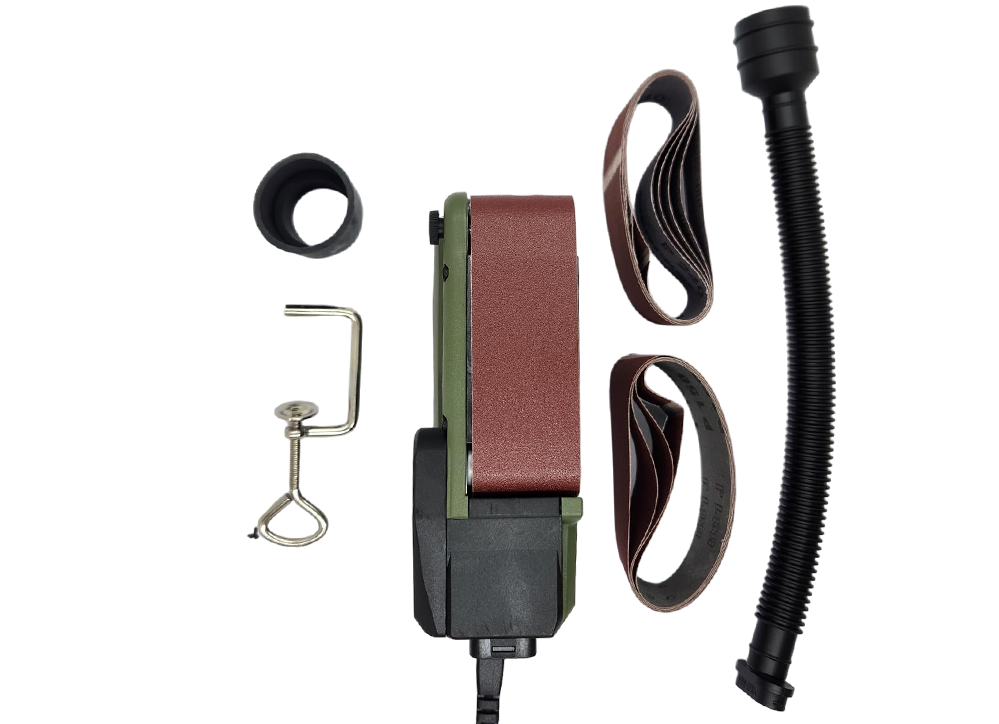The sanding belts are easily replaced without need for tools as rollers are under spring tension. Additionally, a screw clamp for stationary use is supplied.