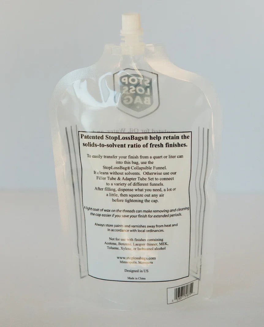 Patented StopLossBags pouches allow you to preserve the fresh off-the-shelf quality of fine finishes. Formulated for oil, water and alcohol-based liquids, the specially formulated 3-ply construction helps prevent loss of solvents while a gas barrier inhibits oxygen penetration into the finish.